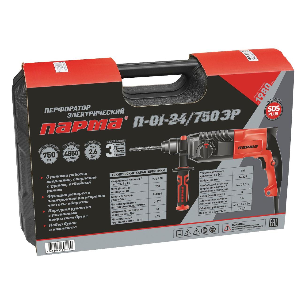 Перфоратор «Парма» П-01-24/750ЭР красного цвета обладает габаритами 10х26х40 см. Максимальный уровень шума в режиме активной эксплуатации — 101 дБ. Уровень потребляемой мощности — не более 750 Вт. Длина встроенного сетевого кабеля — 1,5 м. Число оборотов холостого хода достигает 850 об/мин. Энергия удара составляет 2,6 Дж. Прибор может работать в реверсивном режиме. В комплекте поставляются пять буров, дополнительная рукоятка и кейс для хранения. Максимальный крутящий момент — 35 Н*м. Устройство оборудовано системой электронной регулировки частоты вращения.