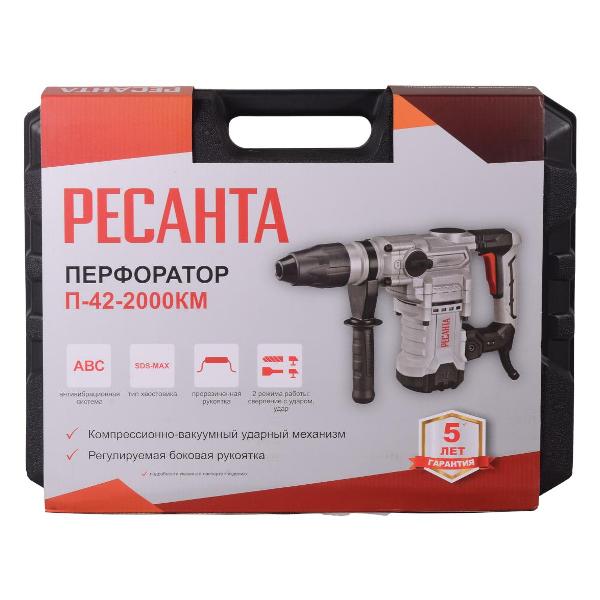 Перфоратор «Ресанта» П-42-2000КМ SDS-Max 75/3/13 оснащен щеточным двигателем мощностью 2000 Вт. Профессиональный инструмент пневматического типа предназначен для сверления, сверления с ударом и долбления. Максимальный диаметр сверления — 42 мм.
