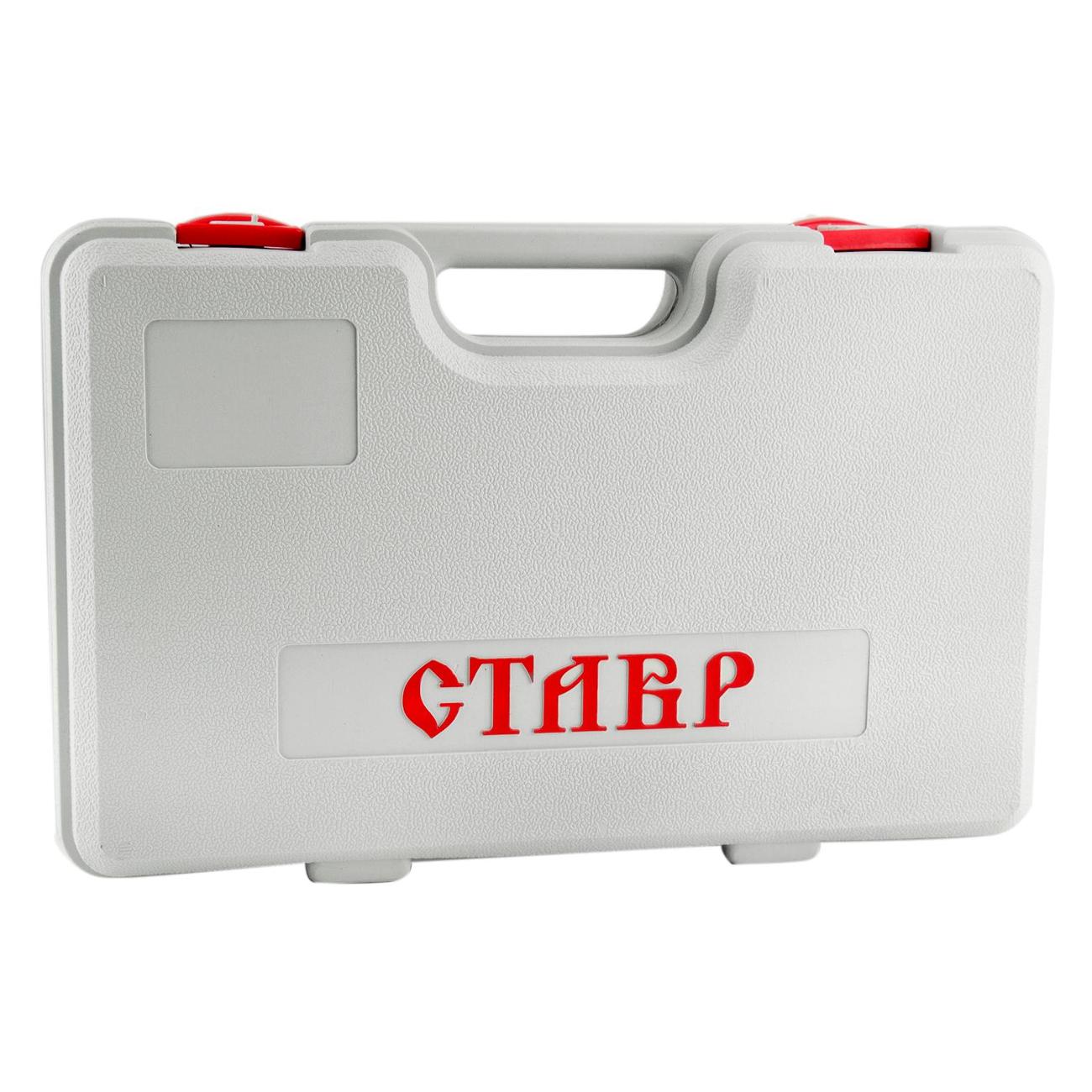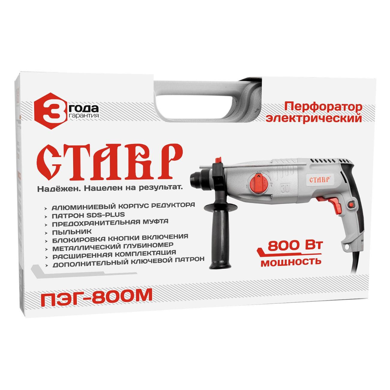 Перфоратор «Ставр» ПЭГ-800М серо-черного цвета оснащен предохранительной муфтой, защищающей от проворачивания инструмента. Кнопка включения блокируется. Габариты модели — 27х11х43 см. Вес изделия — 5,8 кг. Глубина сверления регулируется. Корпус редуктора сделан из алюминия. Диаметр сверления, в зависимости от материала, — 1,3–4 см. Энергия удара — до 4 Дж. В комплектацию входят ключевой патрон с переходником, пыльник, смазка, три бура, кейс для хранения, долото. Щеточный двигатель расположен горизонтально.