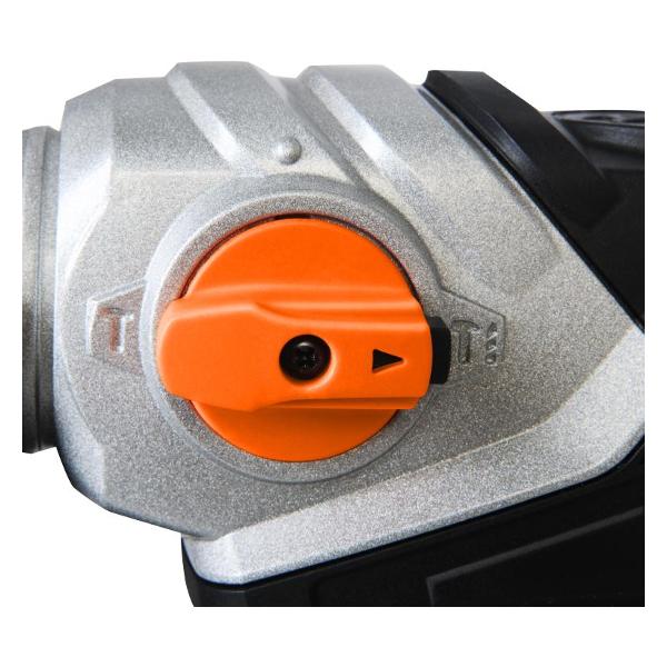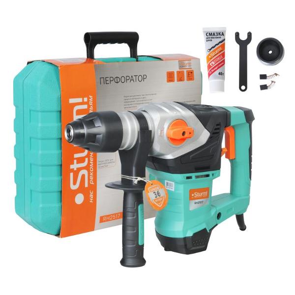 Перфоратор Sturm! RH2517 — бытовой инструмент в корпусе из алюминия черного и бирюзового цветов. D-образная основная и дополнительная прорезиненная рукояти обеспечивают надежное удержание и снижают вибрационную нагрузку на оператора. Прибор работает в трех режимах: обычное сверление, с ударом и удар без сверления.