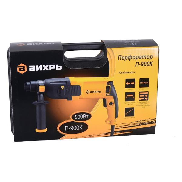 Оранжевый перфоратор «Вихрь» П-900к идет в комплекте с кейсом для переноски и хранения.