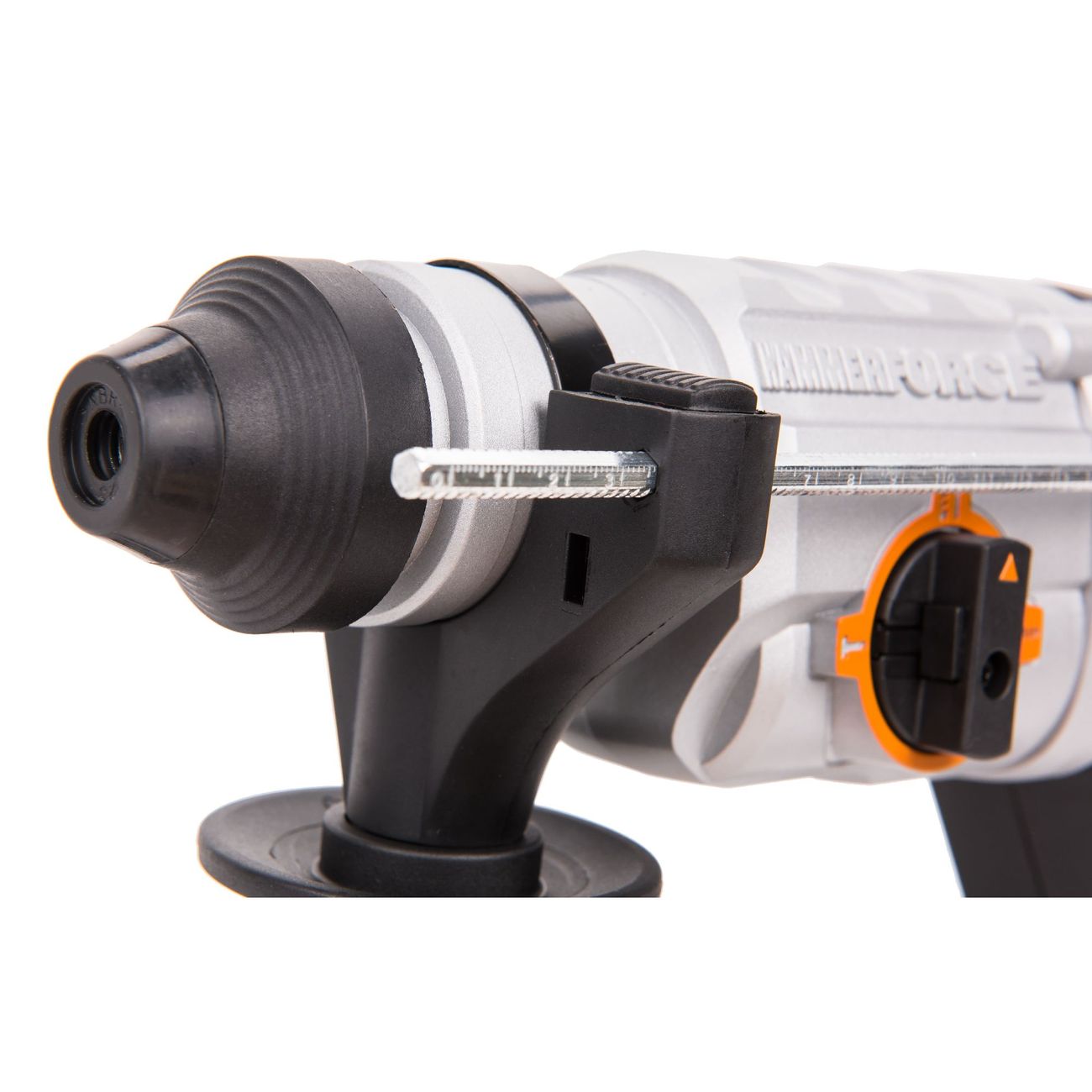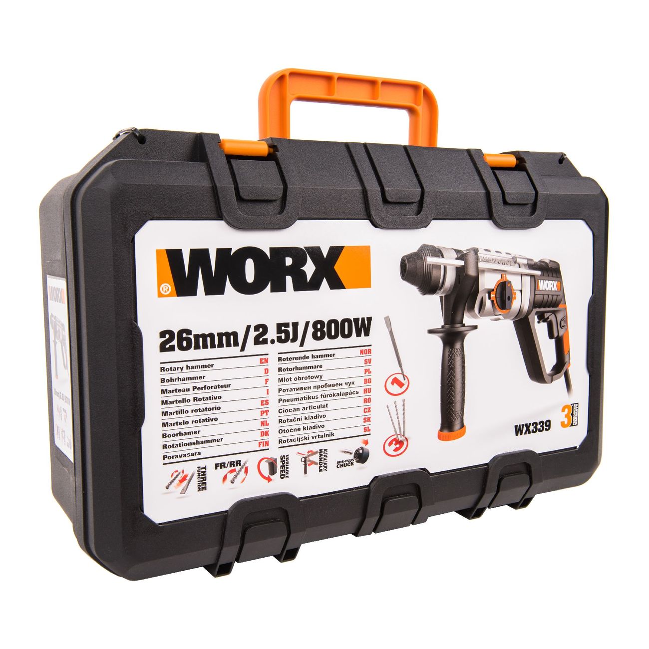 Перфоратор Worx WX339 оснащен щеточным двигателем мощностью 800 Вт. Он работает в трех режимах: сверление, удар и сверление с ударом. Инструмент делает отверстия в дереве и металле, кирпиче и бетоне. Для большей точности работ предусмотрена регулировка глубины.