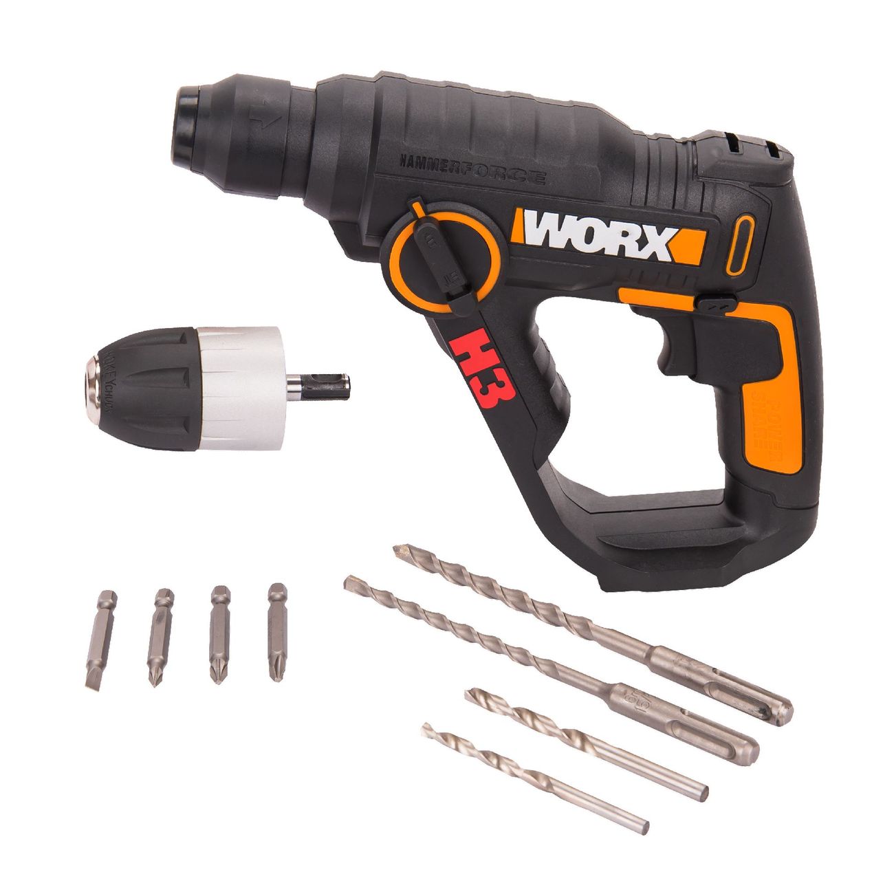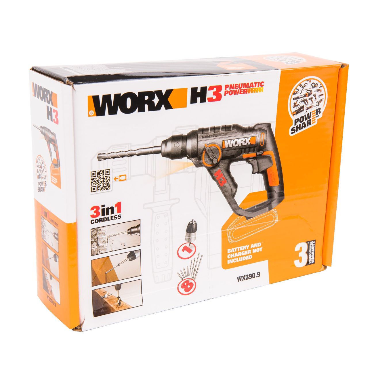 Worx WX390.9 совмещает сразу три инструмента: шуруповерт, перфоратор и ударную дрель. У него высокая производительность до 5000 уд./мин и максимальная мощность удара 1,2 Дж. Подходит для работы с материалами различной плотности: кирпичом, бетоном, сталью, древесиной.