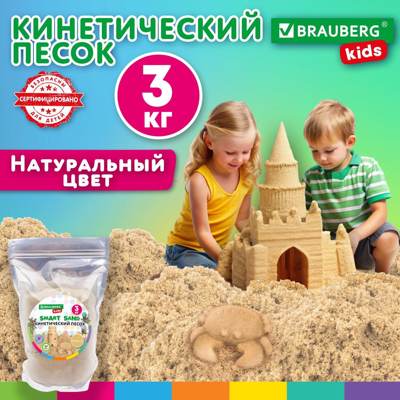 Безопасный кинетический песок BRAUBERG KIDS по текстуре похож на влажный морской песок, но вместе с этим он абсолютно сухой, приятный на ощупь, воздушный и мягкий, прекрасно сохраняет форму во время лепки.