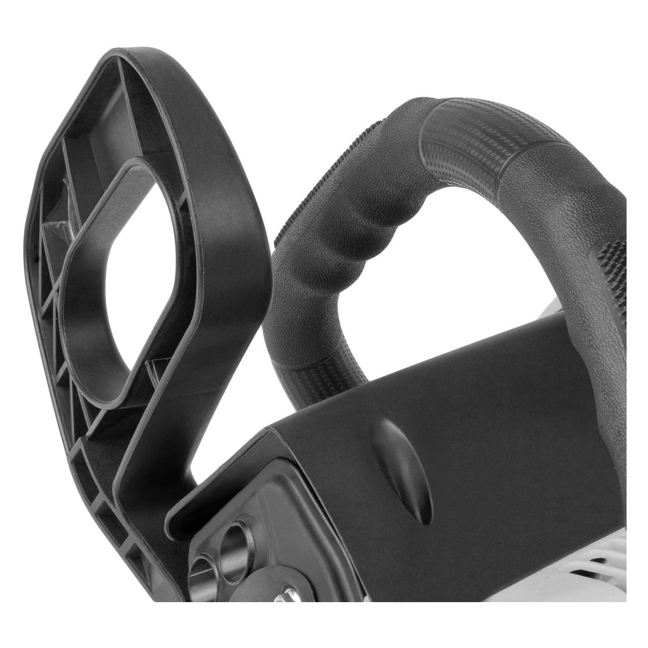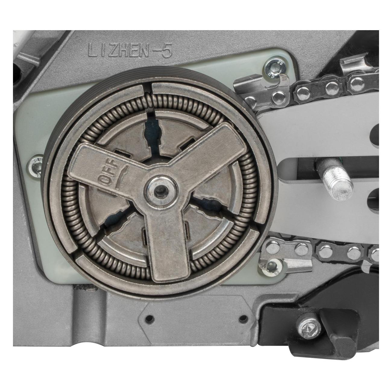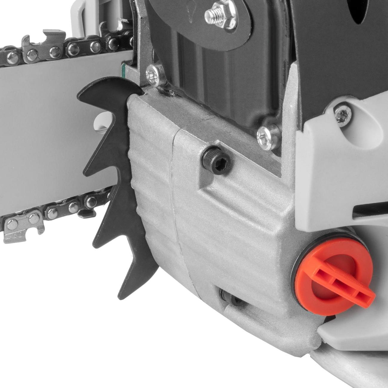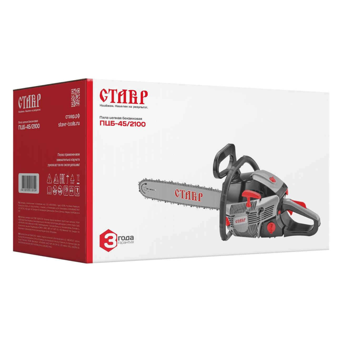Бензиновая пила «Ставр» ПЦБ-45/2100 в серо-черном пластиковом корпусе оборудована шиной длиной 450 мм, цепью из 72 звеньев со скоростью движения 12 м/сек и 2,9-сильным двигателем с масляным баком объемом 0,26 л и топливным — на 0,55 л. Прибор обеспечивает до 3000 оборотов в минуту и расходует 0,792 л топлива за час. Устройство запускается вручную, на торможение требуется меньше 0,1 с. Предусмотрены автоматическая смазка, антивибрационная система и автотормоз. Во время работы уровень шума составляет 102 дБ. При габаритах 28х26х49 см вес составляет 6,5 кг.