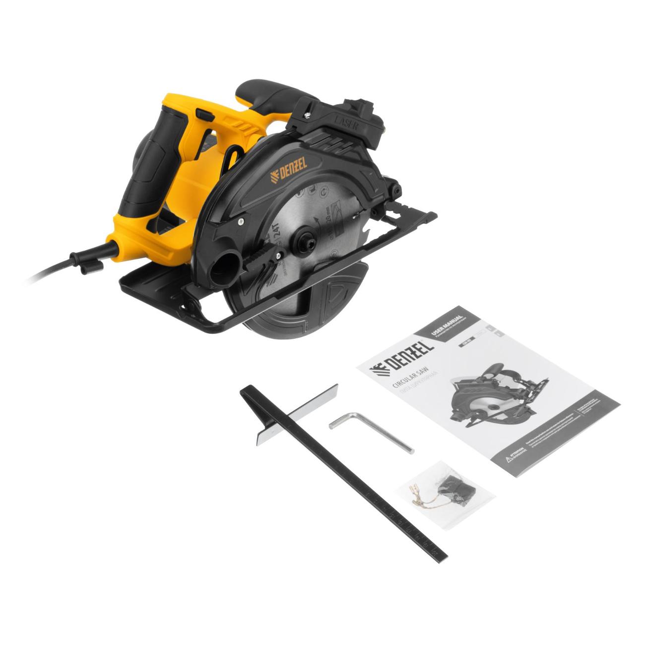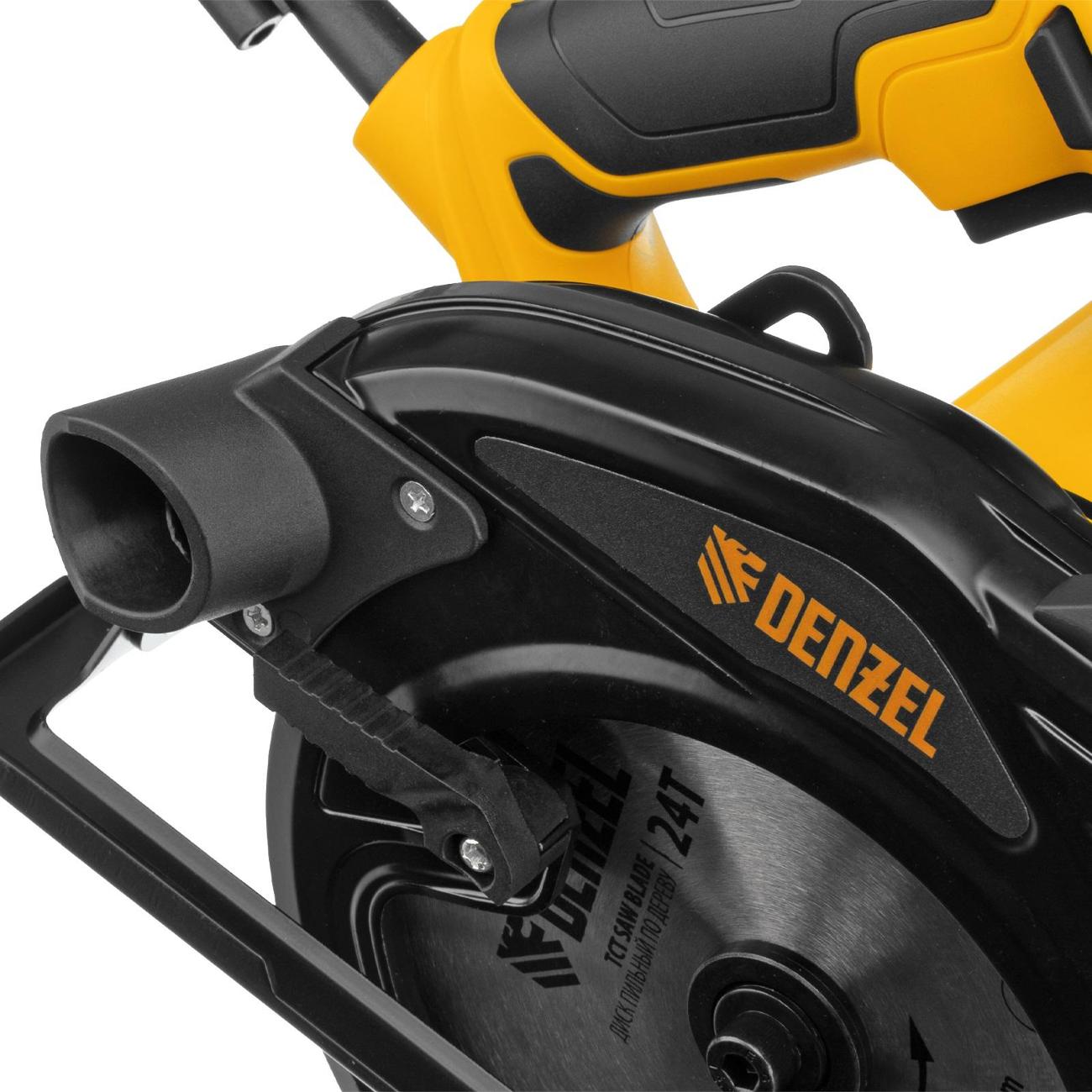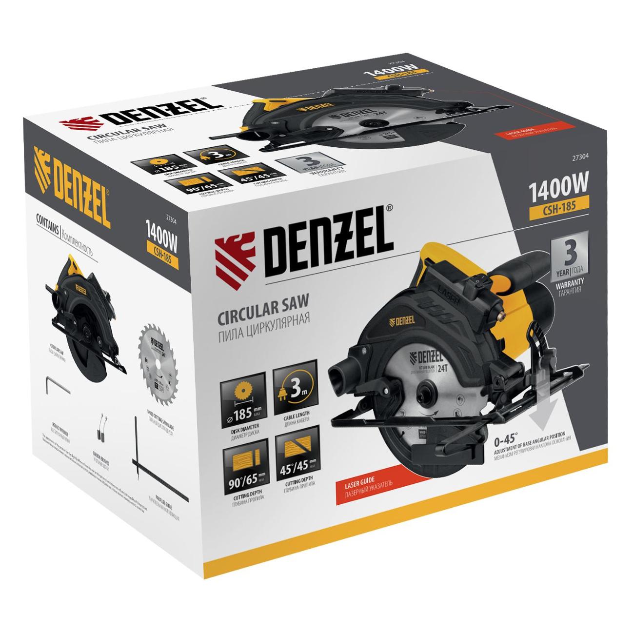 Циркулярная электрическая пила Denzel CSH-185 черно-желтого цвета работает от сети по кабелю длиной 3 м, защищенному от разрыва резиновым покрытием. Инструмент оснащен двигателем мощностью 1,4 кВт, который развивает скорость вращения шпинделя до 5500 об/мин, для работы требуется установка диска диаметром 18,5 см с отверстием под посадку диаметром 30 мм.