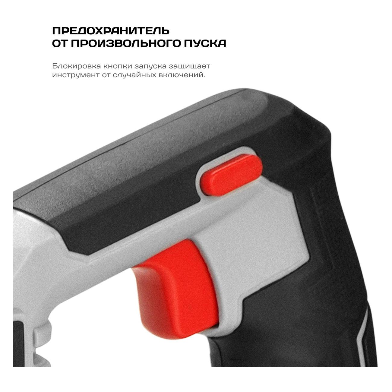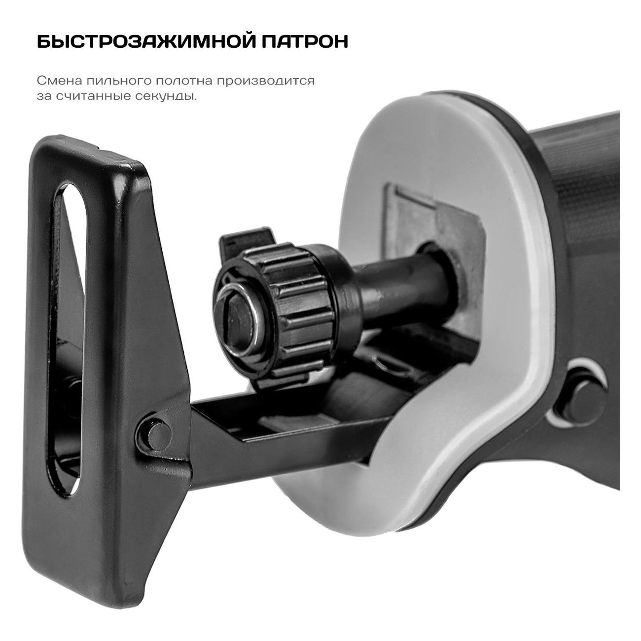 Устройство обладает функциями регулировки числа ходов, бесключевой замены оснастки, плавного пуска и регулировки скорости. Число рабочих оборотов — до 3000 об/мин. Присутствует система поддержания постоянных оборотов под нагрузкой. Длина хода — до 20 мм. Прибор обладает маятниковым ходом. Пила подходит для обработки дерева и металла. Установлен быстрозажимной патрон. Рукоятка прорезинена для обеспечения надежного хвата. Модель оборудована предохранителем от самопроизвольного пуска.