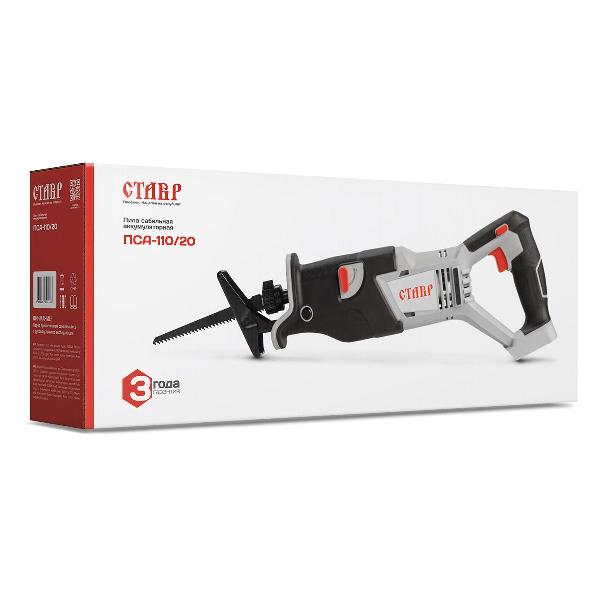 Аккумуляторная сабельная пила «Ставр» ПСА-110/20 черного цвета с серыми элементами обладает габаритами 6х16х44 см. Масса прибора — 2 кг. Питание осуществляется от Li-Ion-аккумулятора емкостью 2 А*ч. Напряжение батареи —20 В. В комплекте поставляется пильное полотно. Корпус изготавливается из пластика и металла. Уровень шума в режиме активной эксплуатации не превышает 78 дБ. Встроена система защиты от случайного включения.