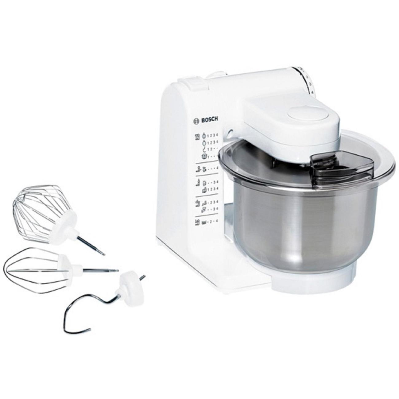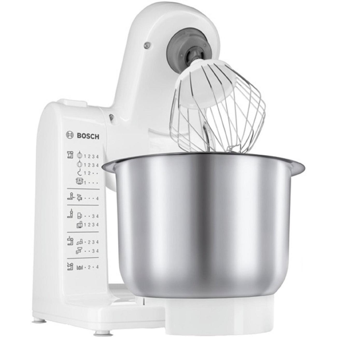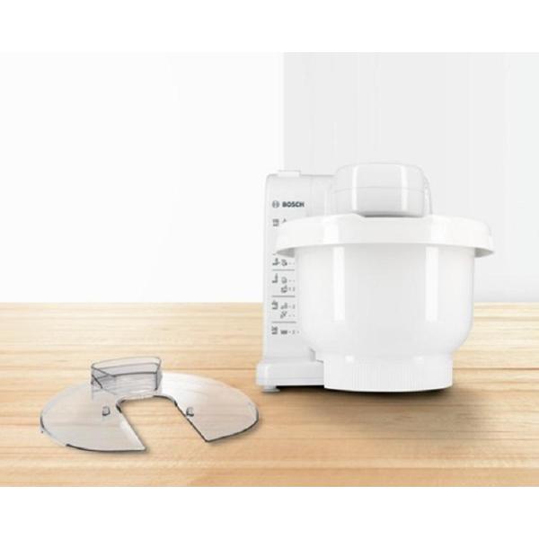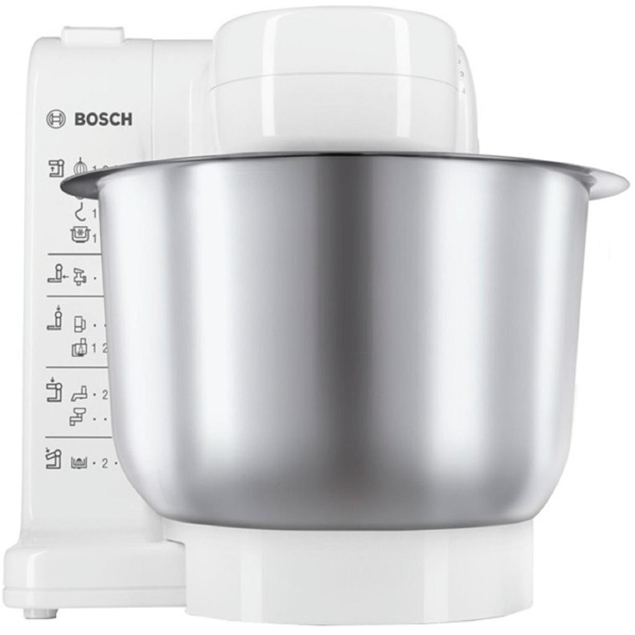 Кухонный комбайн Bosch MUM4407 мощностью 500 Вт объединяет несколько приборов, среди которых миксер, тестомешалка, блендер, упрощая процесс приготовления основных, десертных и закусочных блюд. Бытовая техника состоит из устойчивого основания с ножками-присосками, электродвигателем, управляющим блоком и платформой для крепления насадок с пластиковыми соединениями. На платформе фиксируется металлическая чаша емкостью 3,9 л, которая позволяет замесить до 2 кг легкого и до 1,5 кг дрожжевого теста.