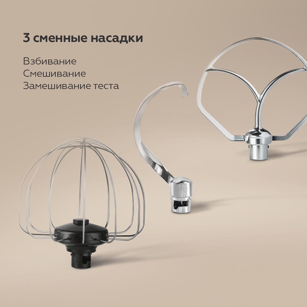Чаша из нержавеющей стали объемом 4.7 литра может вместить большое количество ингредиентов, а специальная крышка с защитой от брызг предотвращает попадание жидкости на устройство и обеспечивает чистоту на вашей кухне. Три насадки - венчик, крюк для замешивания теста и насадка для смешивания - позволяют использовать миксер для разных кулинарных задач. Элегантный дизайн делает прибор отличным дополнением на любой кухне.