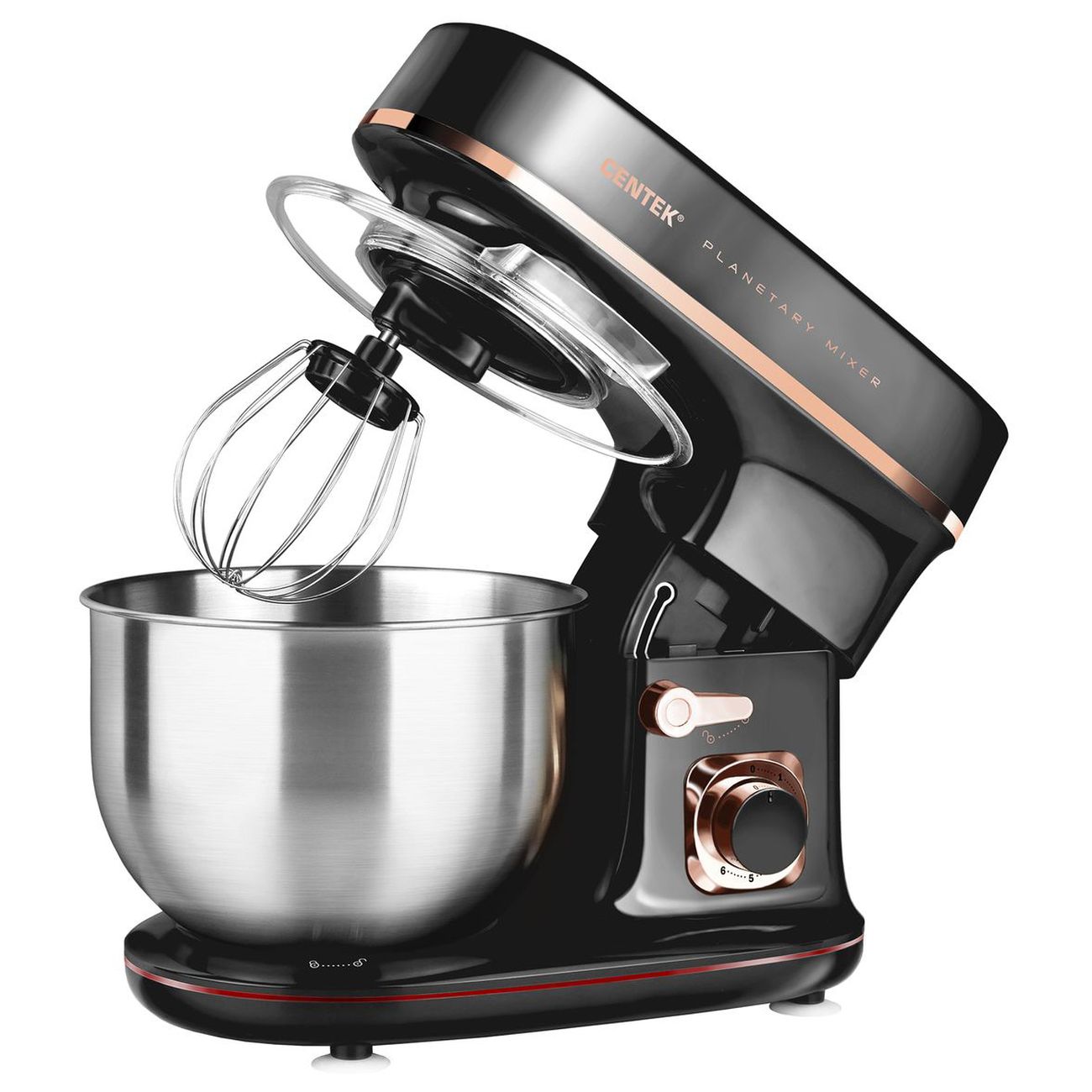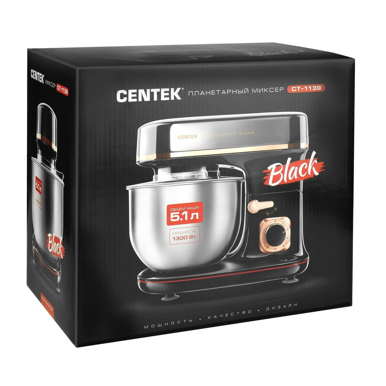 Миксер Centek CT-1139 отличается высокой мощностью (1300 Вт) и большим объемом чаши (5,1 л), позволяющей смешивать сразу множество ингредиентов. Выбор скоростного режима из предложенных шести производится с помощью поворотного тумблера. В комплект входят венчики для взбивания, крюки для замеса теста и насадка для мягких смесей.