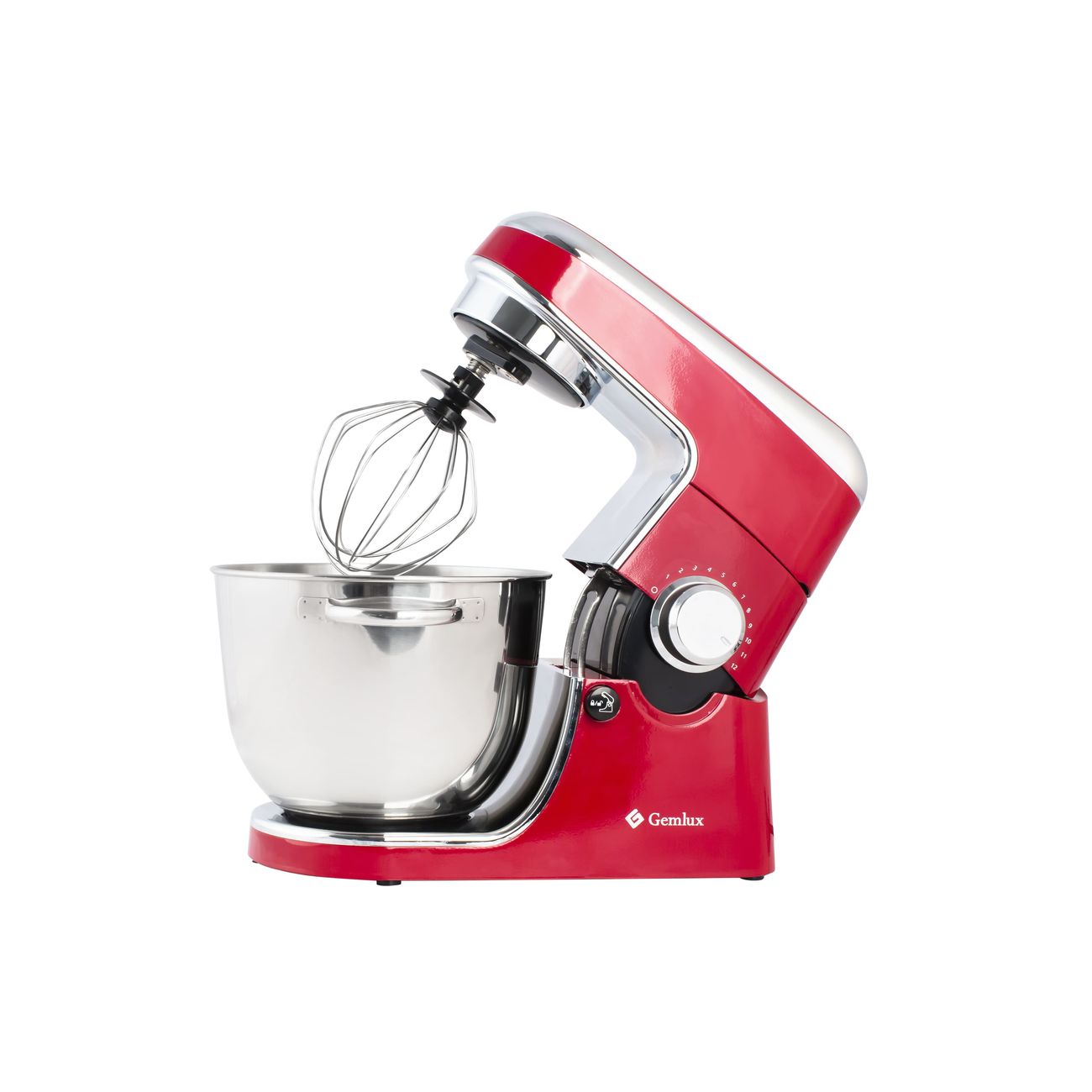 Планетарный миксер Gemlux GL-SM-88R оснащен стальной чашей объемом 4 л. К ней прилагается пластиковая защитная крышка, снабженная желобом для добавления ингредиентов. У прибора 12 скоростей работы, выбор производится поворотом регулятора. В комплект входят три насадки: круглый проволочный венчик, плоская лопатка (битер) и крюк для замешивания густого теста. Для удобства их смены и извлечения чаши головка откидывается. Корпус модели металлический. Мощность — 1000 Вт. Размеры миксера: 35 х27,6 х 29 см, он весит 6,65 кг.