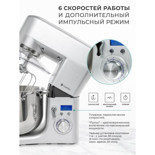 Миксер Gemlux GL-SM10GR в серебристом корпусе — стационарный миксер с механическим управлением, предназначенный для смешивания и взбивания ингредиентов для различных блюд. Шесть скоростей работы позволяют выбирать оптимальную в зависимости от типа продуктов.