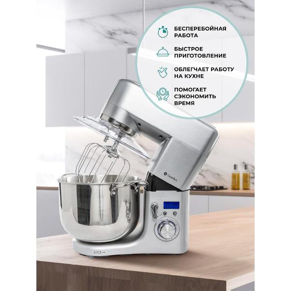 Миксер оснащен импульсным режимом, помогающим достичь высокой интенсивности смешивания. Функция планетарного смешивания обеспечивает равномерное перемешивание продуктов по всей чаше. Встроенный таймер позволяет задать время работы миксера и автоматически остановить работу. Дисплей упрощает настройку параметров работы устройства.