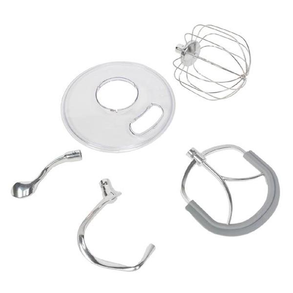 В набор входит чаша объемом 10 л. Она изготовлена из нержавеющей стали. Питание миксера осуществляется от сети с напряжением 220 В. Номинальная мощность устройства — 1500 Вт. Длина сетевого кабеля — 1,2 м. Материал корпуса миксера — алюминий. Лопатки, крюки для теста и насадка для смешивания также входят в комплектацию.