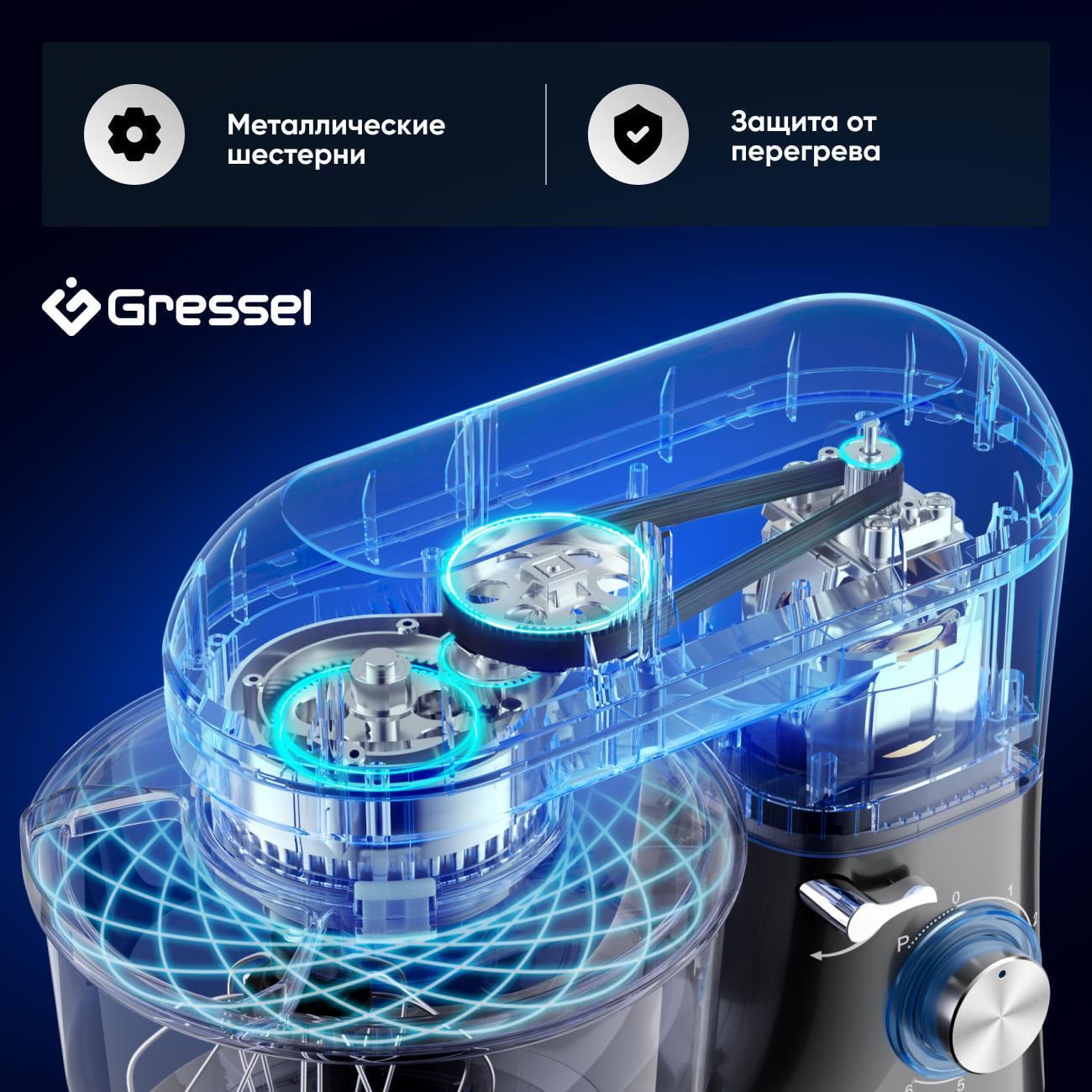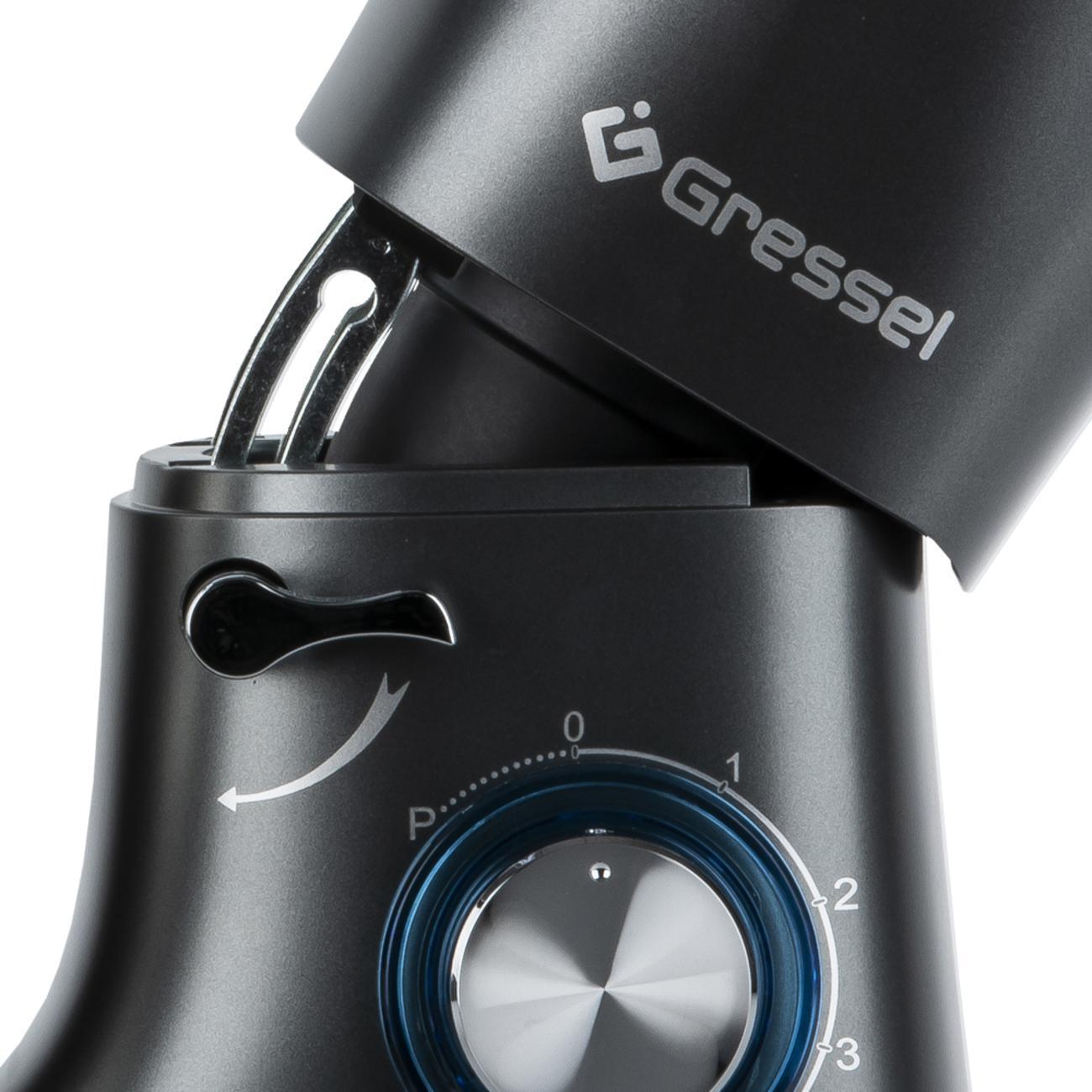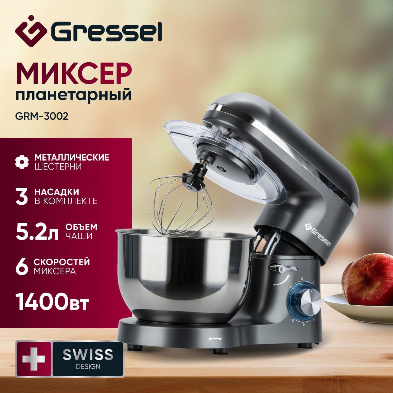 Миксер Gressel GRM-3002 серого цвета при функционировании потребляет мощность в размере 1400 Вт. Электропитание происходит через сетевой провод протяженностью 1,05 м. Механическое управление обеспечивает выбор одной из шести возможных скоростей работы. Емкость чаши из нержавеющей стали для смешивания продуктов составляет 5,5 л. В комплекте идут три насадки: два — для смешивания, один — крюк для замеса теста. Пластиковый корпус устойчиво расположен на прорезиненных ножках. Габариты — 23,8х31,4 см. Общая масса — 4,75 кг. Цвет — серый.