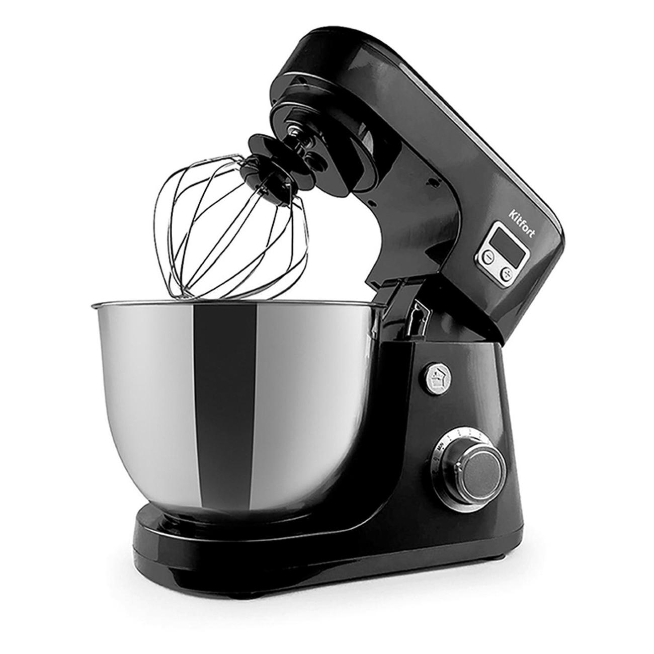 Планетарный миксер Kitfort КТ-1308-3 стационарного типа изготовлен из пластика черного цвета. Панель оснащена дисплеем, который отображает время работы. Встроен таймер прямого и обратного отсчета. Управление электромеханическое: поворотный регулятор управляет шестью скоростями работы, предусмотрены кнопка поднятия рабочей головки и кнопка ускоренного режима. Корпус оснащен индикацией включения, устойчивыми прорезиненными ножками, которые гасят вибрацию и не царапают поверхность.