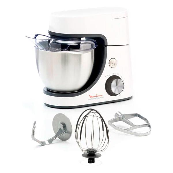 Корпус сделан из ударопрочного пластика. Прорезиненные ножки обеспечивают устойчивость устройства на столе во время использования. В комплект входят стандартная насадка, венчик и крюк для теста. Габариты комбайна — 43,6х31,2х38,7 см, вес — 5,85 кг.