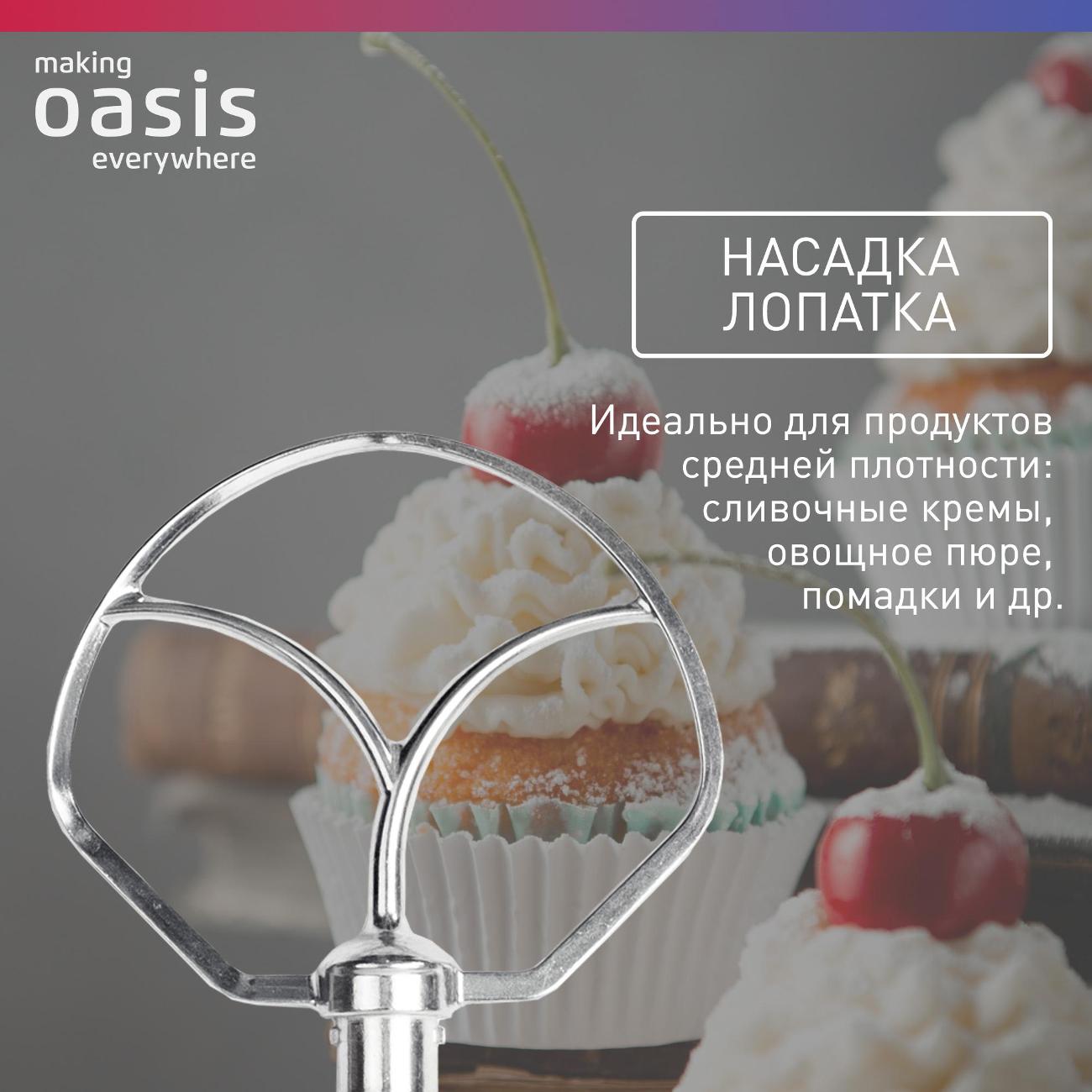 Миксер making Oasis everywhere MP-160B, матовый чёрный обладает мощностью 1600 Вт и всего за несколько минут может взбить яичные белки до стойких пиков или воздушный мусс, замесить тесто, в том числе густое и вязкое дрожжевое, смешать соус и решить много других задач. У прибора восемь скоростей, что позволит подобрать оптимальную в зависимости от ингредиентов и желаемой текстуры. Регулировка производится поворотным элементом, расположенным в боковой части корпуса. Объем чаши составляет 6 л, она изготовлена из нержавеющей стали — износостойкого и гигиеничного материала, не вступающего в реакцию с пищевыми кислотами. Корпус — из пластика. В комплекте поставляются венчик для взбивания, крюк для замешивания теста, лопатка для смешивания и силиконовая лопатка. Длина сетевого шнура — 1,2 м. Предусмотрена защита от перегрева: при риске поломки мотора устройство автоматически выключается. Ножки прорезинены, за счёт чего миксер устойчиво стоит и не двигается по столешнице даже во время работы на максимальной скорости. Габариты миксера: 385х332х232 мм, вес — 5,33 кг.
