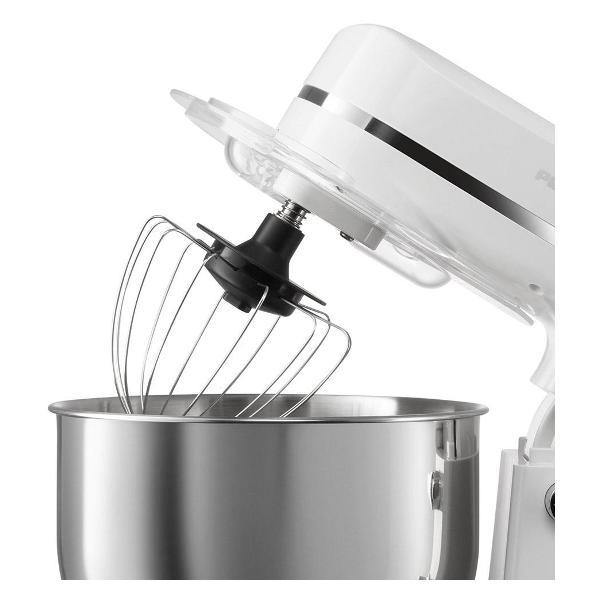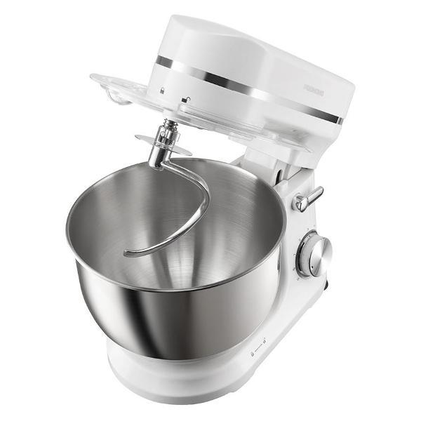 Защитный обод не только предотвращает выброс мучной пыли, но и оснащен полезным функционалом. В конструкцию встроено отверстие для добавления ингредиентов в процессе работы, а также специальный сепаратор для яиц.