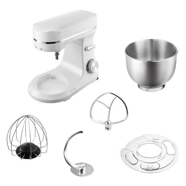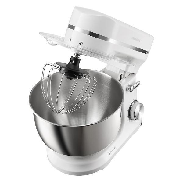 В комплекте поставляются три насадки: крюк для густого теста, лопатка для смешивания фарша или глазури и венчик для взбивания. Устойчивость корпуса весом 4 кг обеспечивают прорезиненные ножки-присоски. Габариты модели составляют 333×285×187 мм.