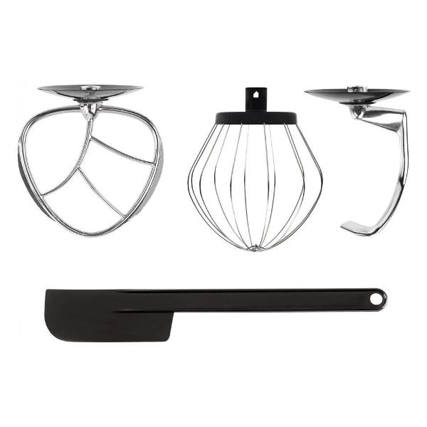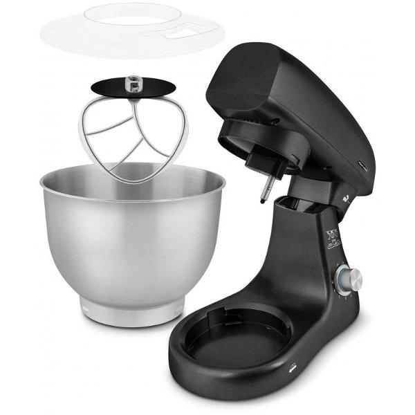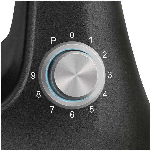 Автоматическое поднятие рычага происходит нажатием кнопки, что обеспечивает удобство использования. В комплекте поставляются три насадки (венчик, крюк, лопатка для смешивания), прозрачная крышка для защиты от брызг с отверстием для добавления ингредиентов и лопатка. Габаритные размеры составляют 25х37х37 см, вес миксера — 6 кг.