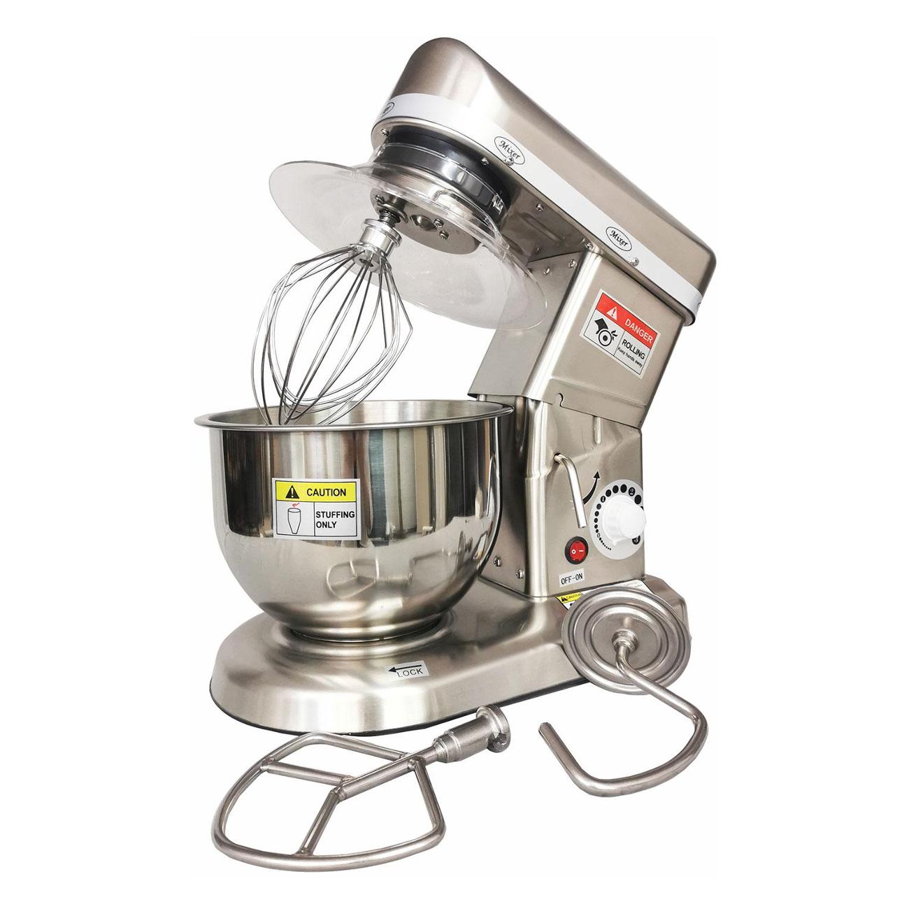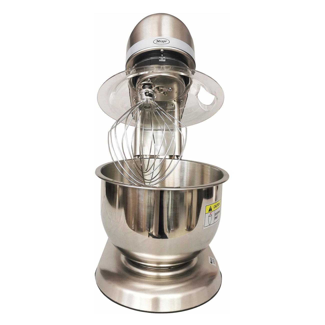 Миксер Viatto VA-SMB5SS 161550 стального цвета идет в комплекте с тремя насадками (лопатка, крюк и венчик), оснащен подъемной траверсой. Чаша объемом 5 л сделана из стали с антикоррозийным покрытием, крышка — из легкого пластика. Плавный запуск двигателя исключает появление брызг при включении прибора. Габариты модели — 38х37,5х24 см. Вес изделия — 13 кг. Способ управления — механический. Мощность — 0,5 кВт. Планетарная система вращения насадок позволяет равномерно перемешивать продукты по всему объему чаши.