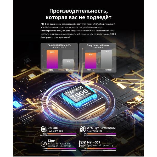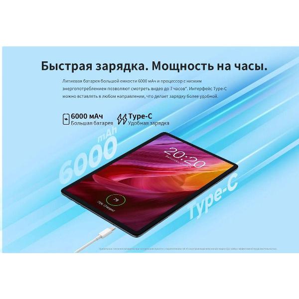 Экран с технологией IPS по диагонали составляет 10,1" (1920x1200 пикс). ROM —128 Гб, RAM — 8 Гб, процессор — восьмиядерный. Установлена операционная система Android 13. Вес — 515 г. Габариты — 160,1х241х8,4 мм. В набор входят блок питания и USB-кабель. Работает модель на аккумуляторе емкостью 6000 мА*ч в течение 8 ч без подзарядки.