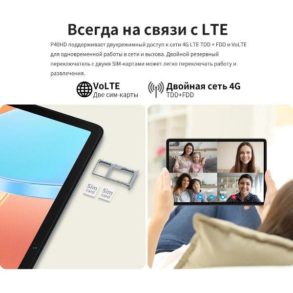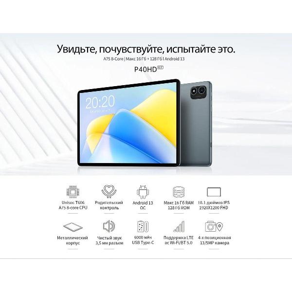 Планшет Teclast P40HD 8/128GB серого цвета выполнен в металлическом корпусе. Присутствует фронтальная камера, два встроенных динамика, микрофон. Интерфейсы USB-C, разъем для наушников и микрофона 3,5 мм обеспечивают проводное подключение. Передача данных происходит с использованием модулей Bluetooth, Wi-Fi. Возможно использование карты памяти.