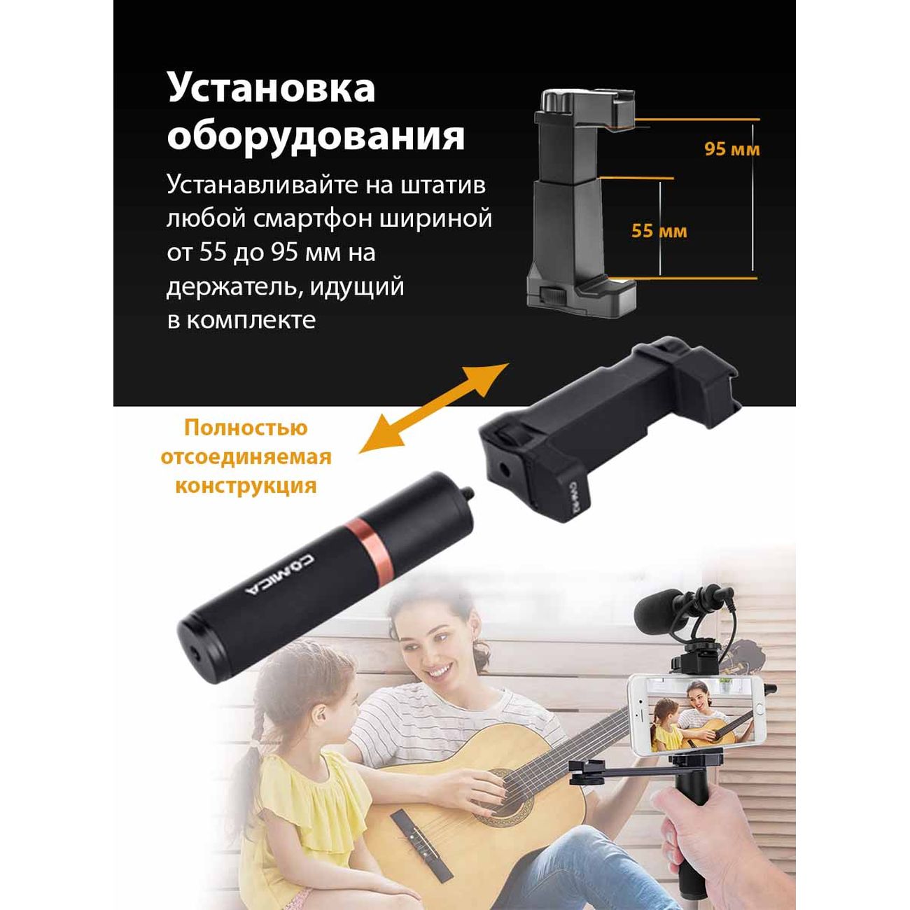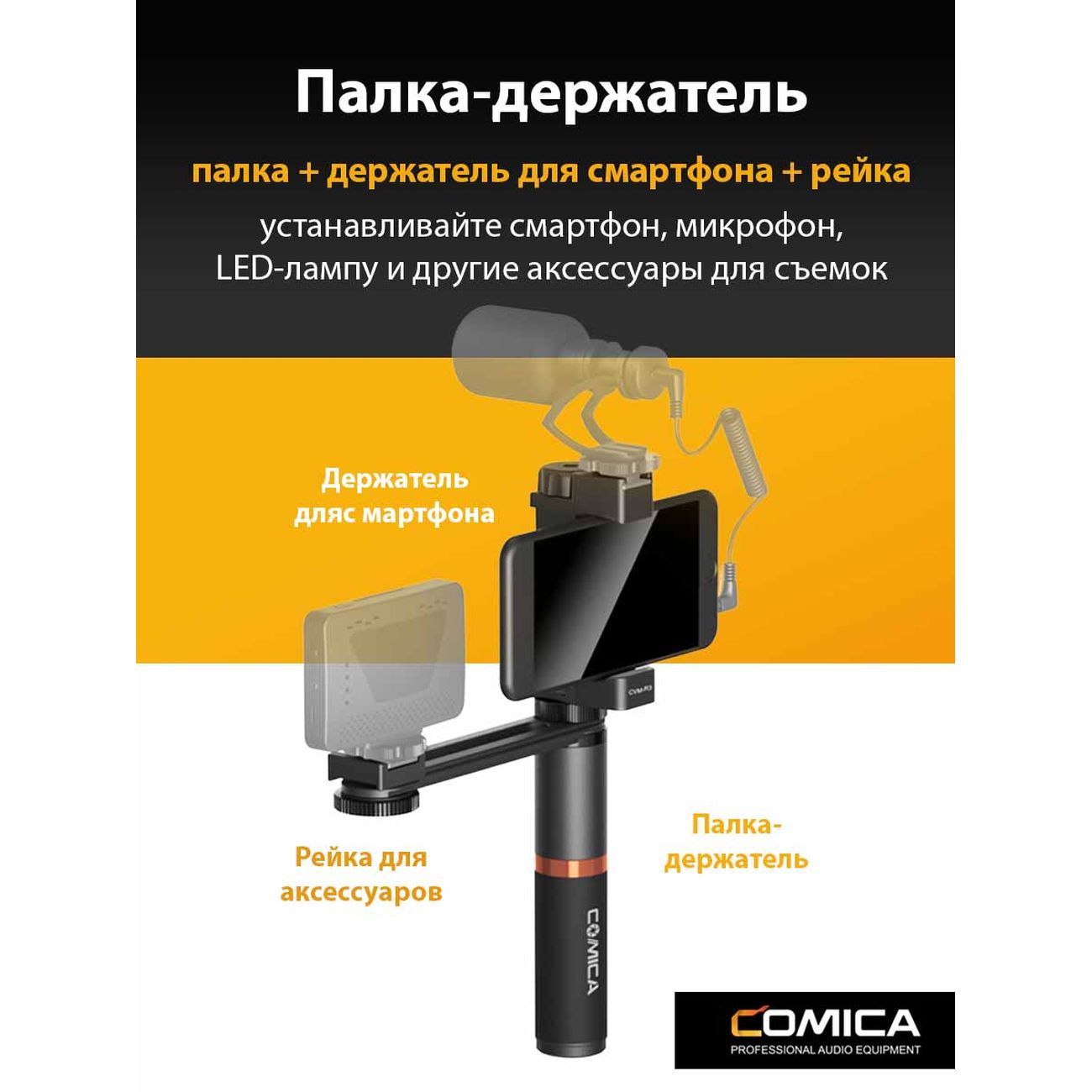 Подставка для микрофона CVM-R3 CoMica CVM-R3 в корпусе черного цвета — монопод. Модель оснащена держателем для смартфона шириной от 50 мм до 90 мм. Корпус подставки комбинированный, изготовлен из металла и пластика. Материалы характеризуются устойчивостью к деформации и механическим повреждениям. Встроенные LED-лампы обеспечивают комфортную съемку в любое время суток.