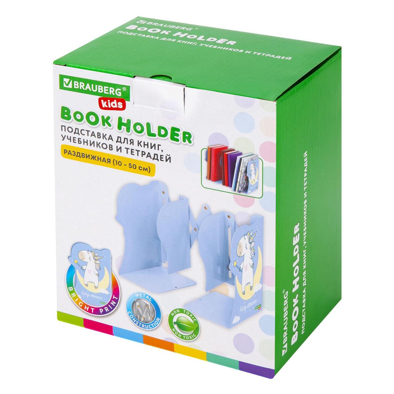 Подставка-держатель BRAUBERG KIDS полностью выполнена из металла, поэтому она прочная и долговечная. Размер – 19х10(50)х15 см. Держатель для книг раздвигается от 10 до 50 см, что позволяет разместить большое количество книг и учебников. Подставка выполнена в оригинальном дизайне, который понравится детям.
