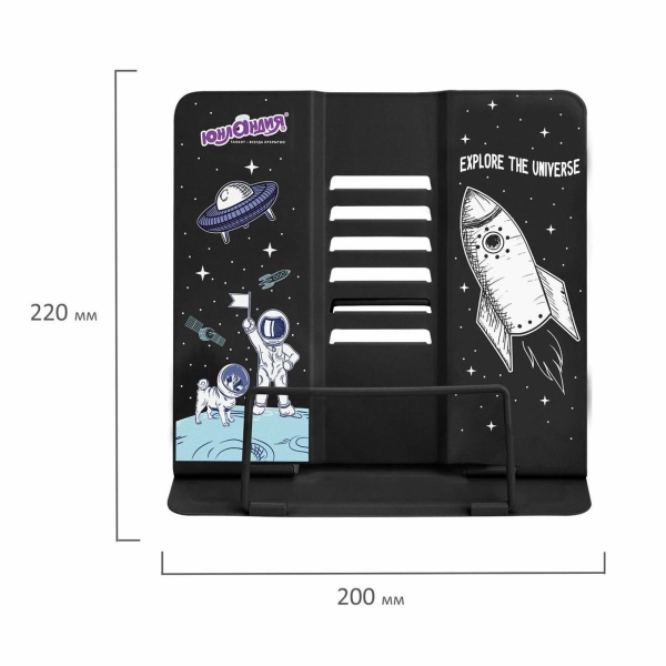 Подставка полностью изготовлена из металла, поэтому отлично подойдет для надежной фиксации тяжелых и объемных учебных материалов и книг. Оригинальный дизайн понравится как младшим школьникам, так и школьникам среднего звена. Регулируемый угол наклона обеспечивает удобство при работе с текстом, облегчает чтение и подготовку домашней работы. Размер подставки – 20х18,5 см. Цвет – черный.