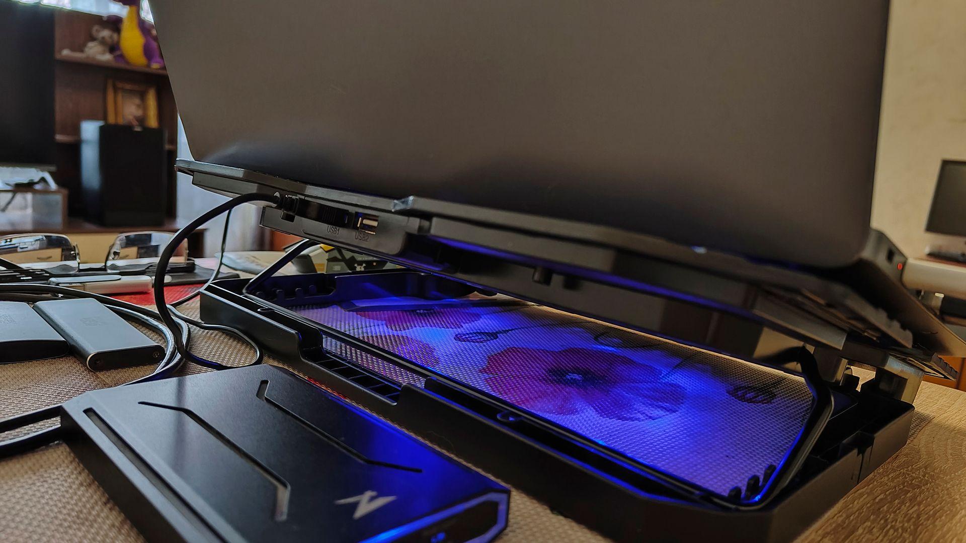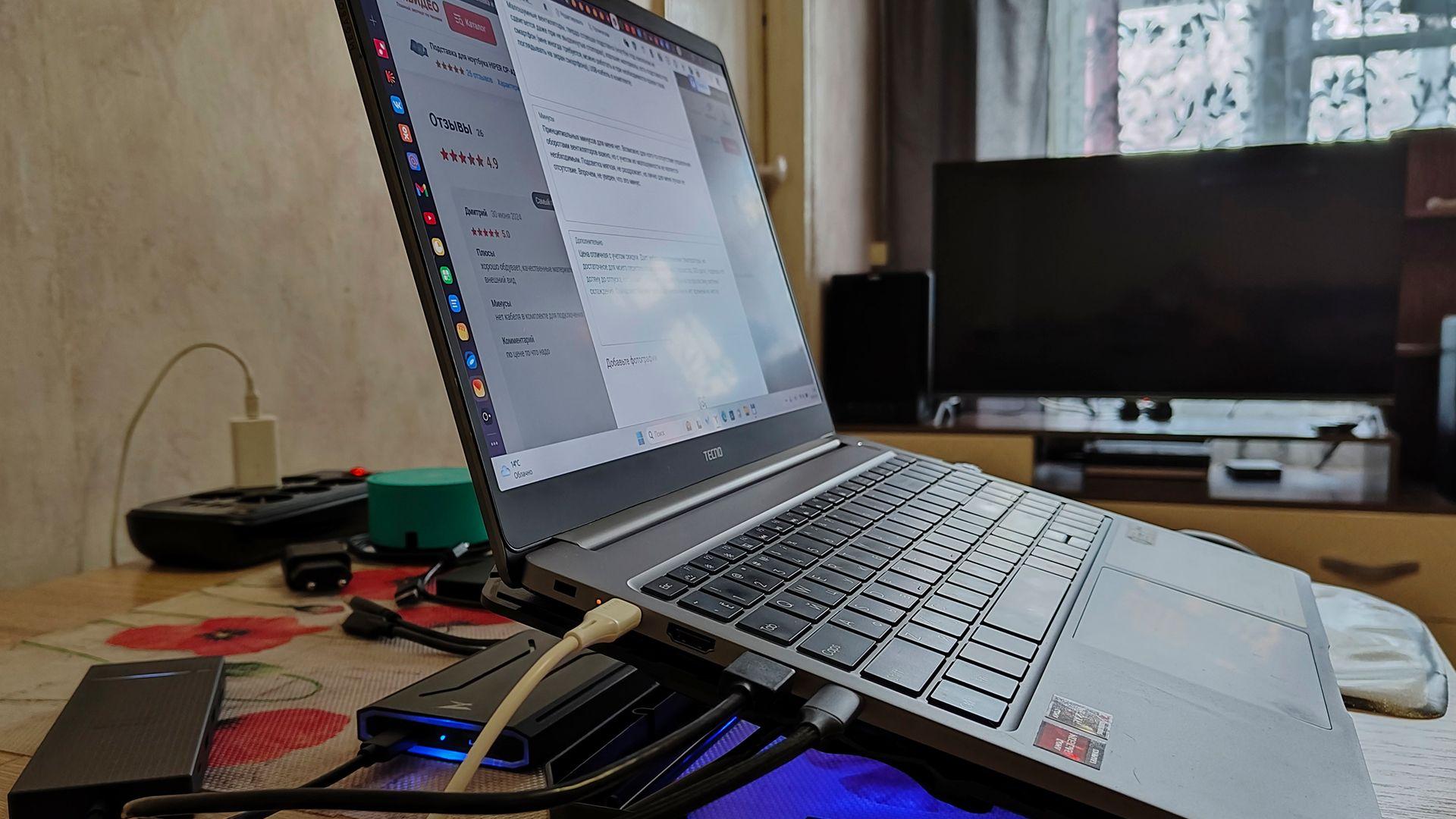 Малошумные вентиляторы, твердо стоящая подставка (ноутбук под наклоном не сдвигается даже при не выдвинутых стопорах), хорошие материалы, есть подставка под смартфон (мне иногда требуется, можно работать и при необходимости краем глаза поглядывать на экран смартфона), USB-кабель в комплекте.