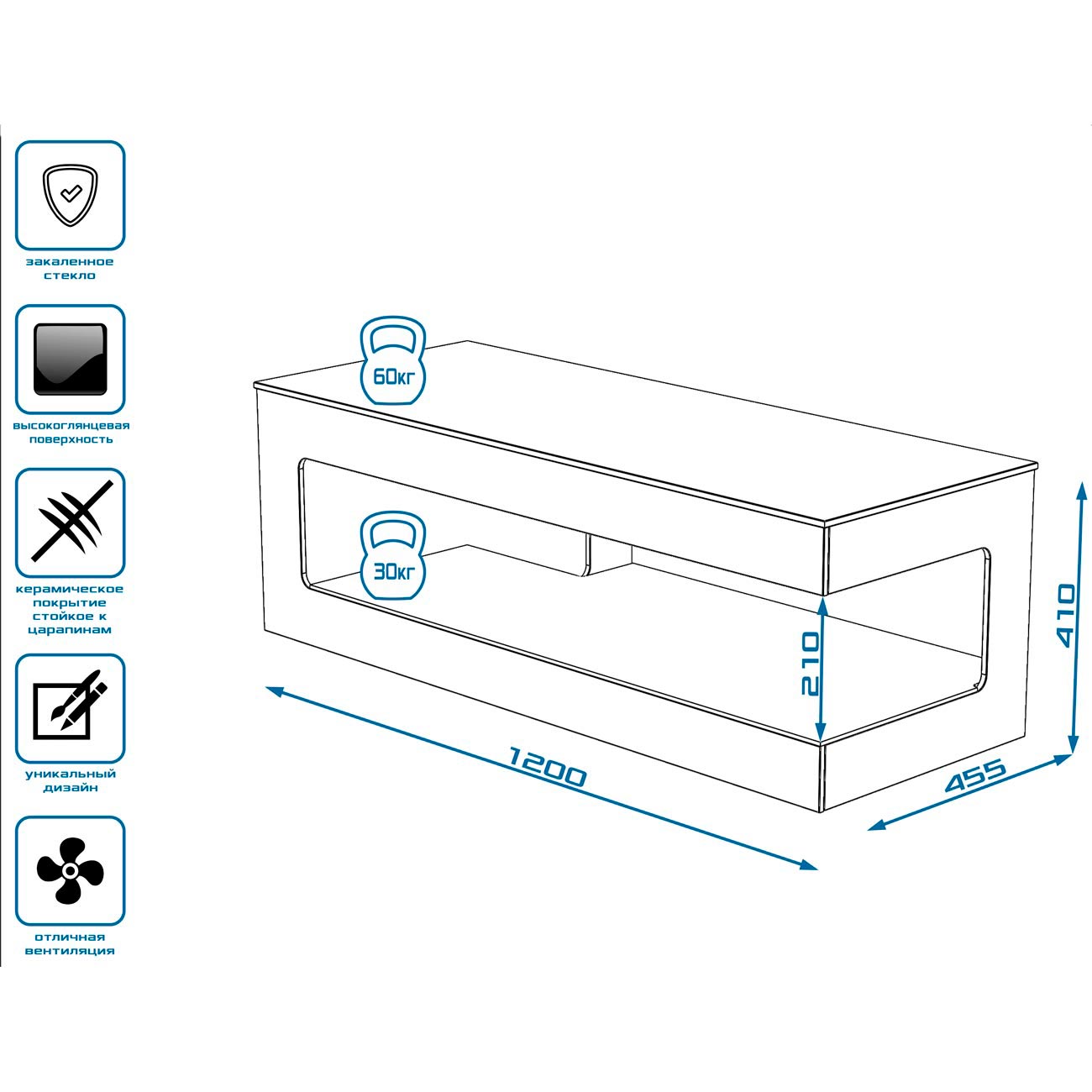 На поверхности подставки можно расположить телевизор с диагональю экрана до 60 дюймов. На высокой нижней полке поместятся крупногабаритные мультимедийные устройства – в том числе ресивер, плеер класса Hi-Fi и центральный канал акустики.