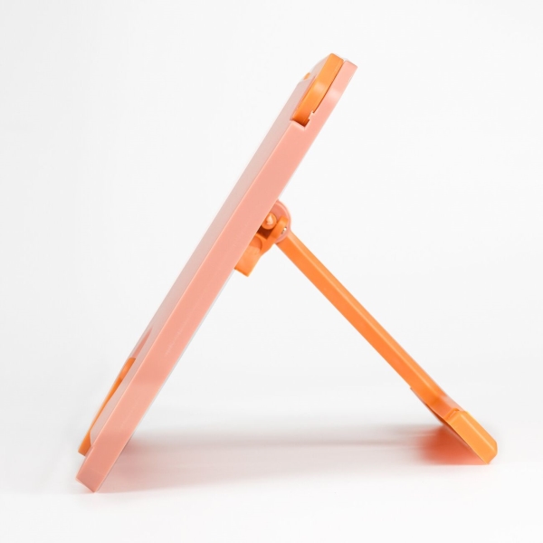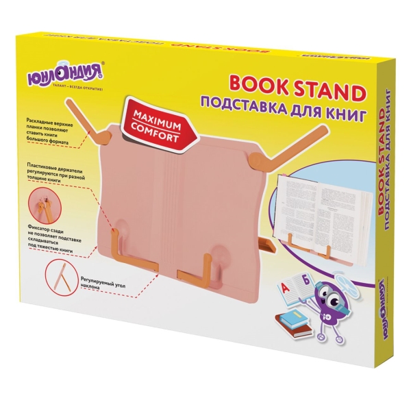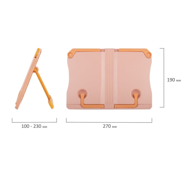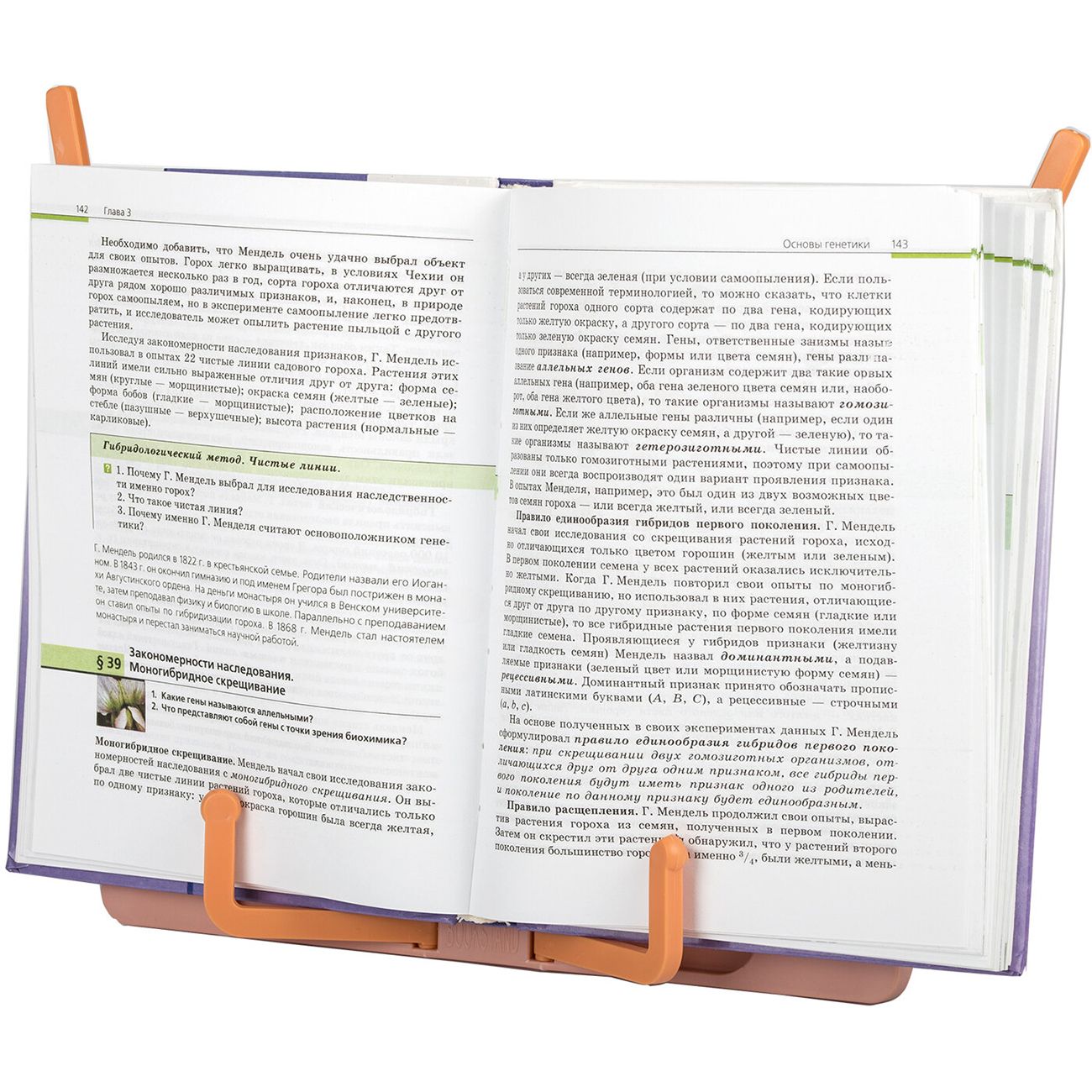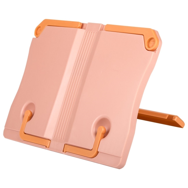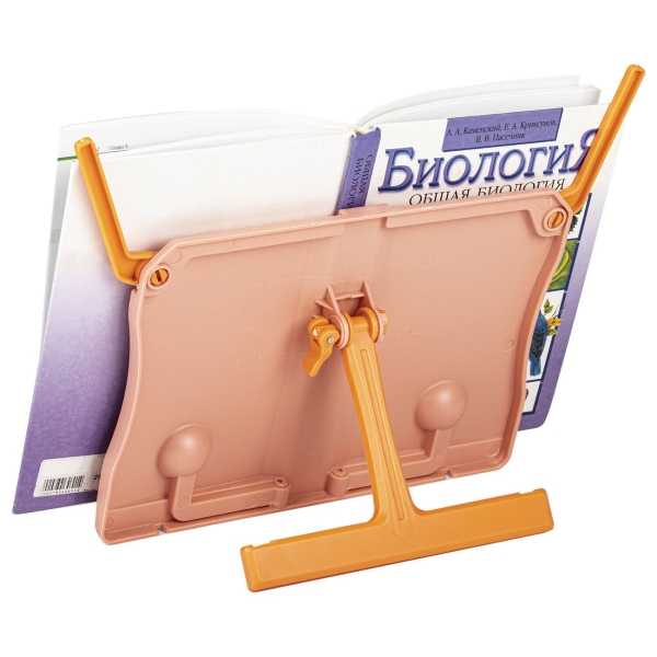 Изготовлена из прочного пластика. Регулируемый угол наклона обеспечивает удобство при работе с текстом, облегчает чтение и подготовку домашней работы. Раскладные верхние планки позволяют размещать книги большого формата. Нижние держатели регулируется в зависимости от толщины книги. Блокиратор позволяет надежно зафиксировать подставку на столе и не позволит ей упасть от тяжести книги. Размер подставки - 19х27 см. Цвет корпуса - розовый. Цвет держателей - оранжевый.
