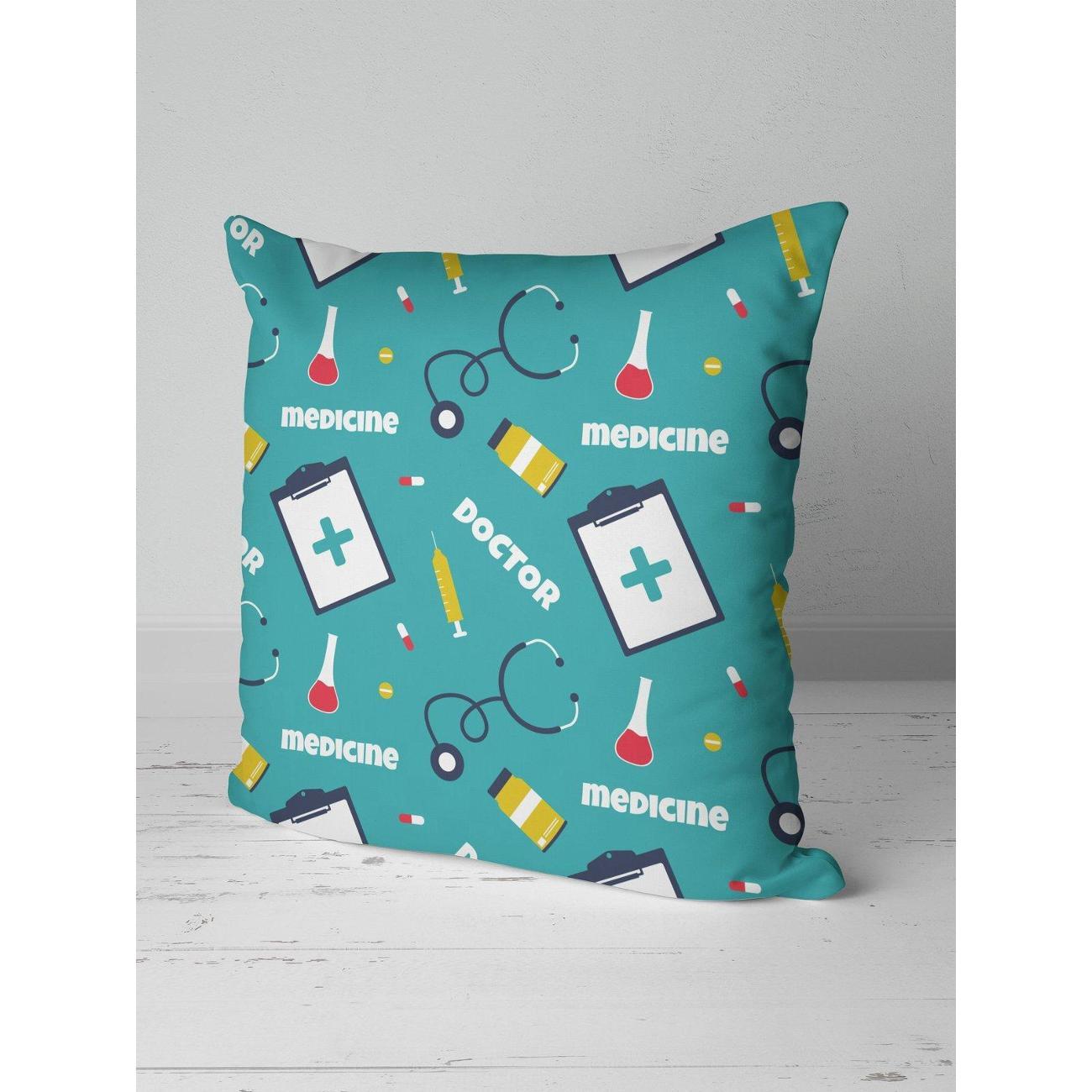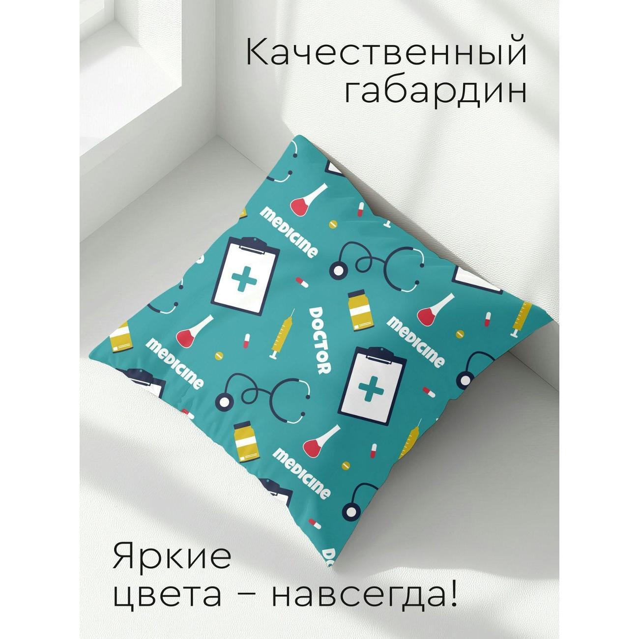 Рисунок: Медицинский паттерн: стетоскоп, шприцы, таблетки, колбы, планшеты с крестом, надписи "DOCTOR", "MEDICINE".