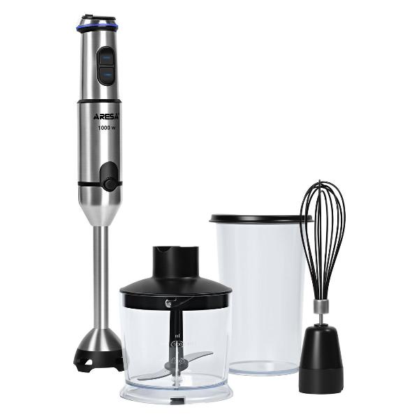 Погружной блендер Aresa AR-1129 комплектуется венчиком и чоппером объемом 0,5 л, что делает модель многофункциональным кухонным помощником.