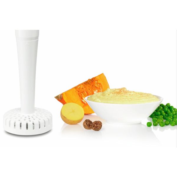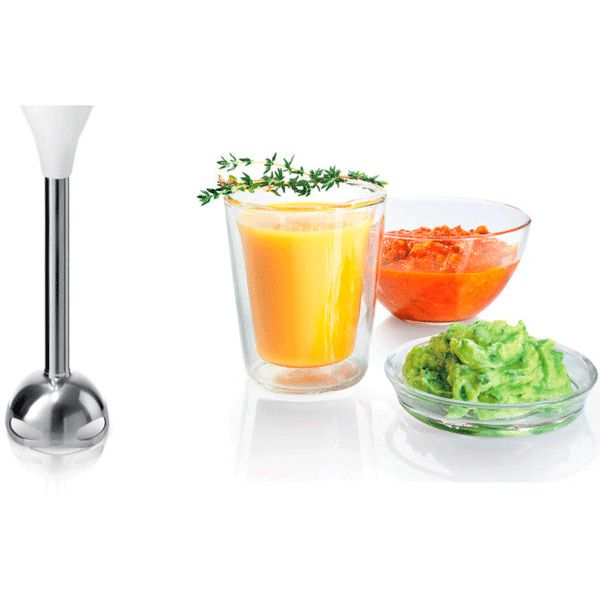 Управление осуществляется при помощи кнопок на ручке. Длина сетевого провода составляет 1,4 м. Благодаря эргономичной зоне захвата прибор удобно держать в руках. Съемные детали можно мыть в посудомоечной машине. Вес блендера — 1,1 кг.
