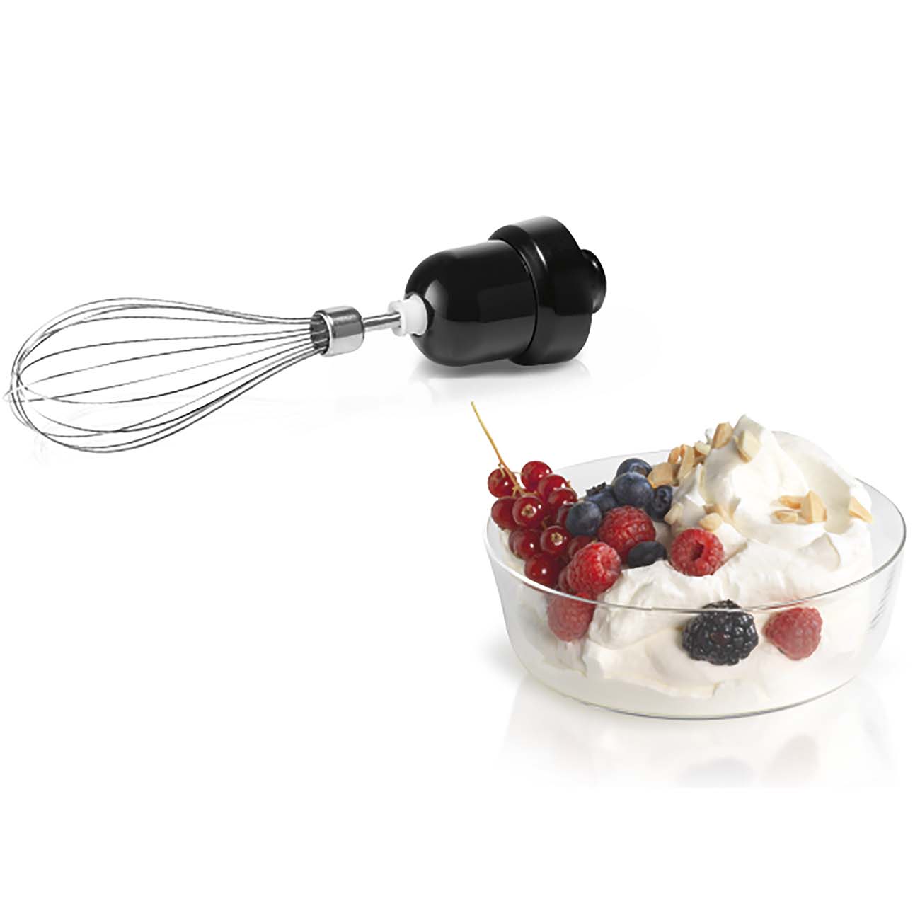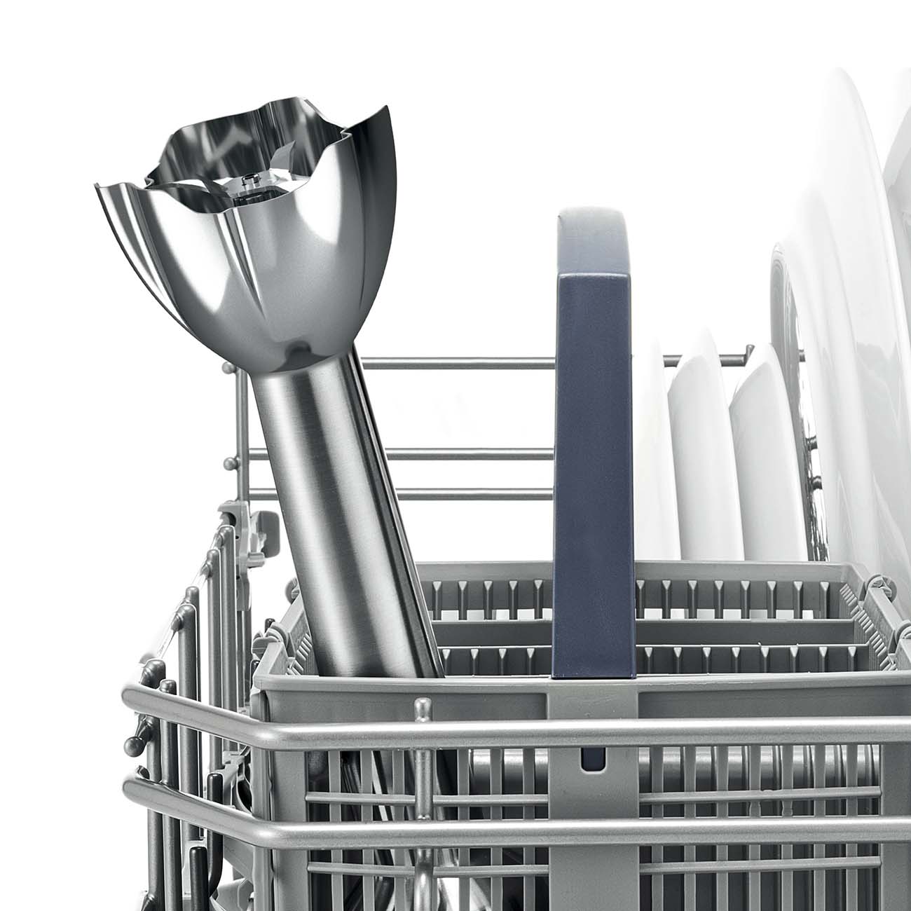 Отличные результаты обеспечивает технология Quattro Blade Pro – четырёхлезвийный нож, выполненный из высококачественной нержавеющей стали. Его прикрывает купол с особыми направляющими, предотвращающий разбрызгивание – после готовки в кухне будет чисто. Ножка легко отсоединяется нажатием на кнопку. Её, как и все прочие детали (за исключением моторного блока, крышек редуктора, комбайна и венчика), можно мыть в посудомоечной машине.