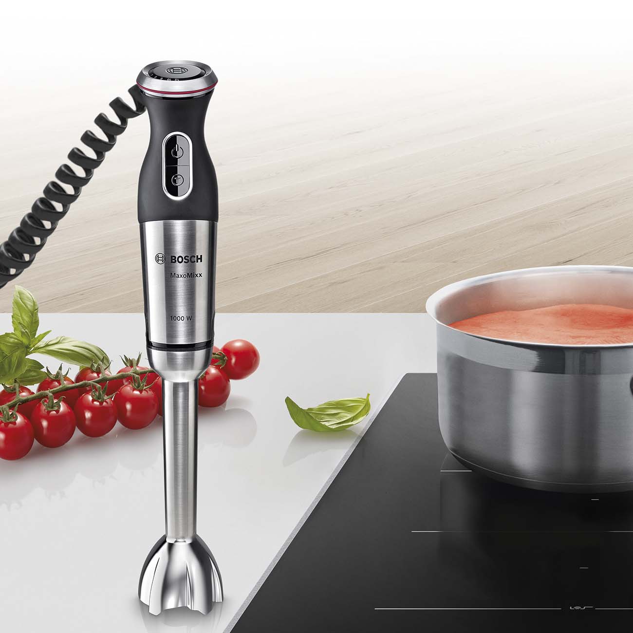 Погружной блендер Bosch MS8CM61X1 с мощным 1000-ваттным двигателем позволит быстро измельчать, смешивать, шинковать, делать овощные и фруктовые пюре. В комплекте есть различные насадки и приспособления.
