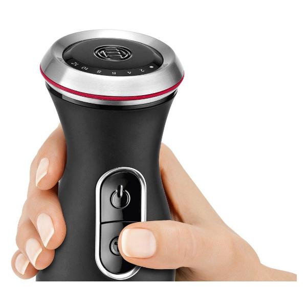Погружной блендер Bosch MS8CM61X1 подходит для взбивания жидкостей и для мелкой резки продуктов любой плотности. Корпус выполнен из пластика, в месте захвата нанесено прорезиненное покрытие. Встроено две кнопки для включения устройства и работы в режиме «Турбо». Доступна регулировка скорости на 12 позициях. Съемная погружная часть и ножи сделаны из нержавеющего металла. В наборе идет три емкости на 600, 500 и 1250 мл. Также в комплект входит венчик и насадка для замешивания теста. Блендер подключается к бытовой электрической сети кабелем питания длиной 2,6 м. Потребляемая мощность составляет 1000 Вт.