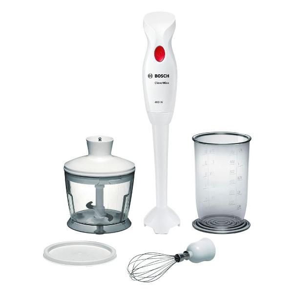 Погружной блендер Bosch MSM 14500 комплектуется венчиком для взбивания, измельчителем, стаканом с крышкой объемом 700 мл. На стакан нанесена мерная шкала. Цвет прибора — белый с красной кнопкой. Корпус, кувшин, погружная часть выполнены из пластика, лезвия изготовлены из стали, устойчивой к коррозии.