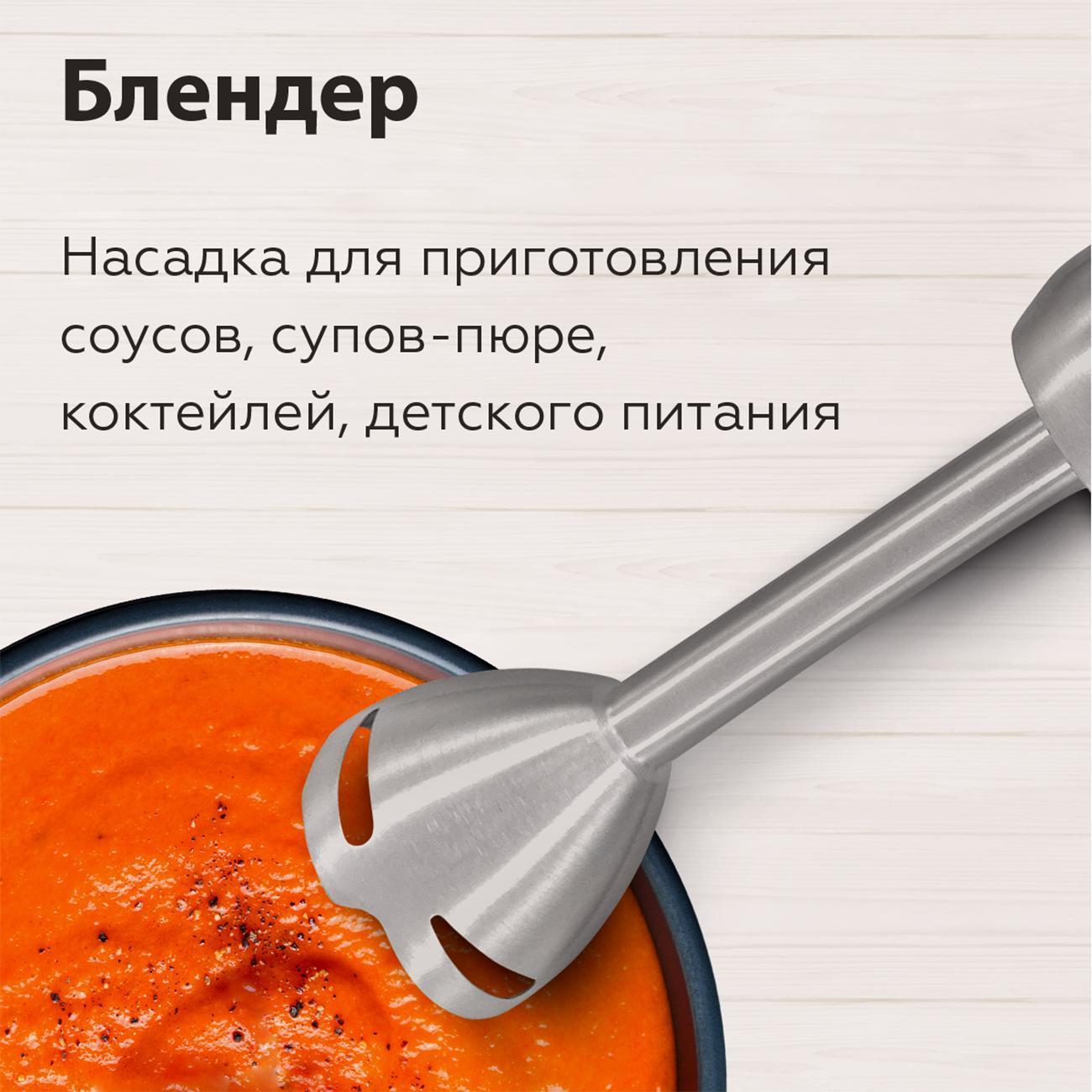 Особое внимание было уделено качеству материалов: насадки изготавливаются из нержавеющей стали, что не только обеспечивает их долговечность, но и гарантирует высокую гигиеничность. Комплектация включает в себя насадку-блендер с крестообразным ножом, насадку-миксер, насадку-измельчитель и насадку для пюре, что делает этот прибор поистине многофункциональным.