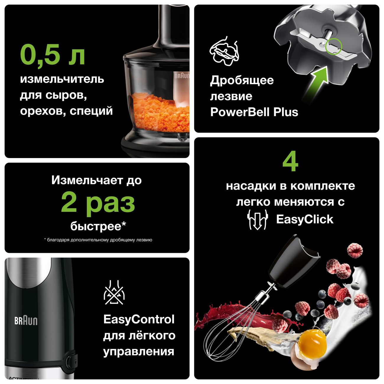 Стержень ActiveBlade позволяет лезвиям погружной насадки двигаться вверх и вниз. Это обеспечивает отличные результаты при смешивании твёрдых продуктов: например, сырых овощей. Все кусочки будут тщательно переработаны, не охваченных не останется.