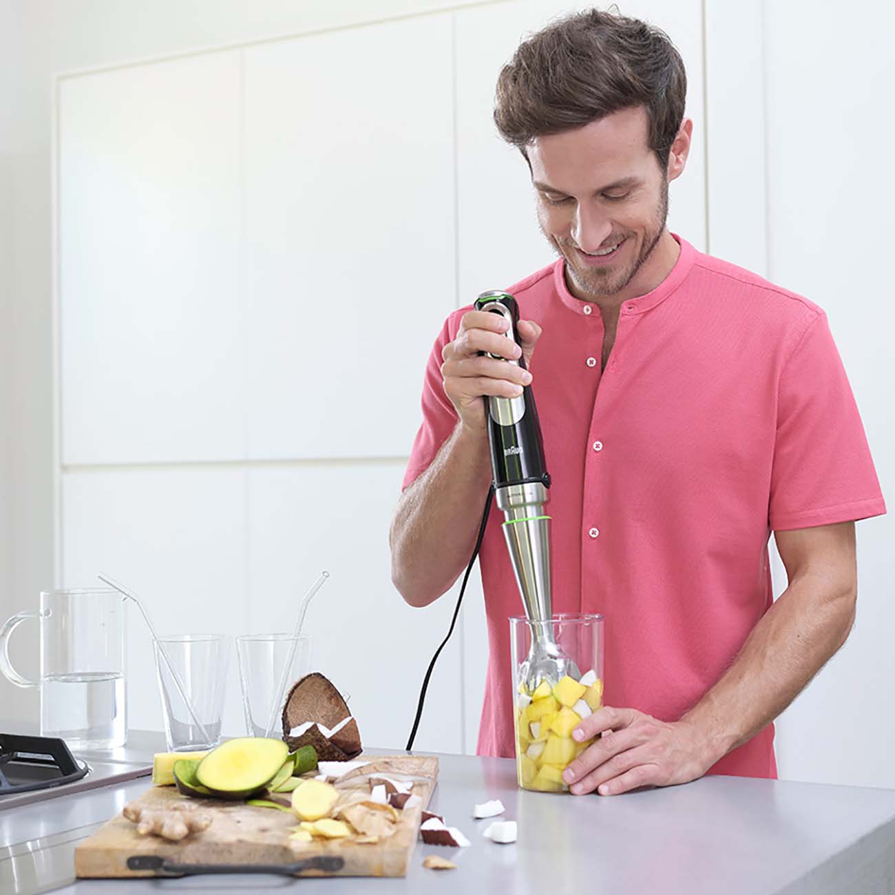 Braun HB901AI-MQ9195XLI – больше, чем просто погружной блендер. Богатая комплектация позволяет одним движением руки превратить модель в измельчитель, миксер или даже кухонный комбайн, и всё благодаря уникальным фиксаторам EasyClick.