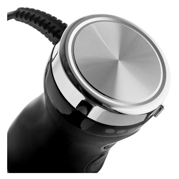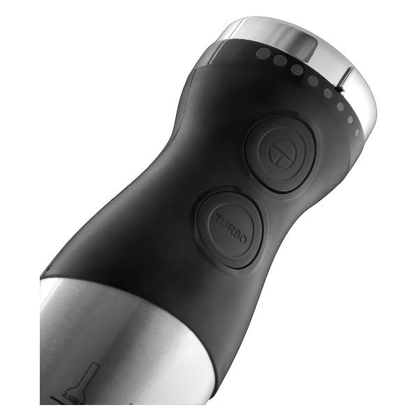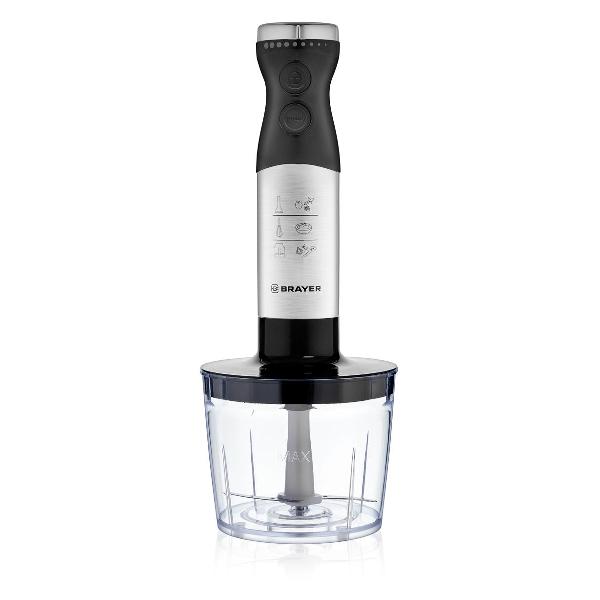 Погружной блендер Brayer BR1244 в черно-стальном исполнении комплектуется четырьмя насадками, пластиковым кувшином объемом 500 мл и мерным стаканам на 700 мл. Измельчающая часть прибора выполнена из нержавеющей стали и может очищаться от остатков продуктов при помощи посудомоечной машины. Модель потребляет 800 Вт мощности и поддерживает плавный запуск двигателя, турборежим и девять скоростей, регулируемые механическим управлением. Питание осуществляется от сети при помощи 1,2-метрового кабеля.
