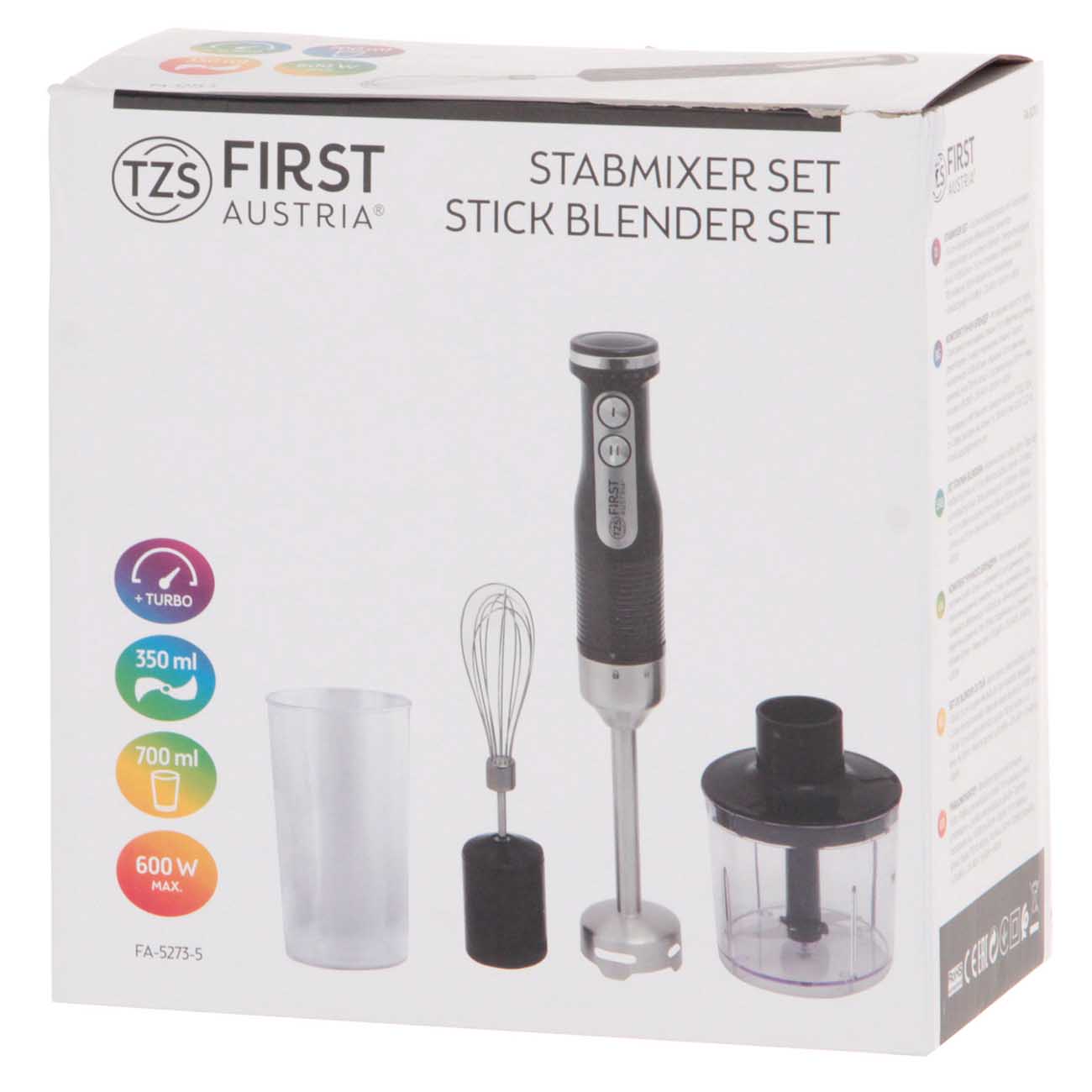 FA-5273-5 – погружной блендер с мотором 600 Вт. Кроме основной насадки, которая позволит тщательно измельчать фрукты или овощи для детского плодового пюре, перемешивать ингредиенты молочного коктейля и готовить однородное по консистенции тесто для кекса или блинов, в комплекте предусмотрен венчик для взбивания и измельчитель с большой чашей.