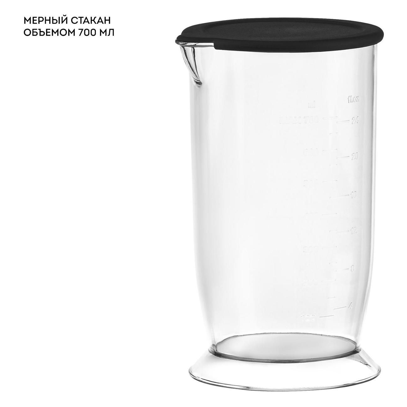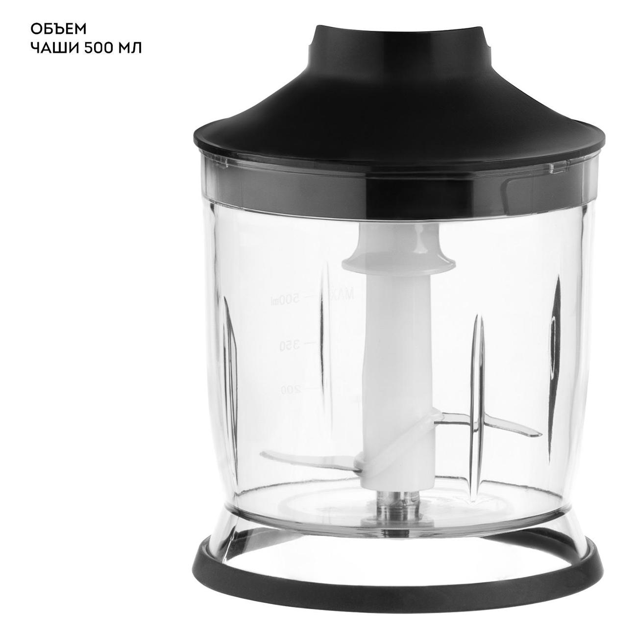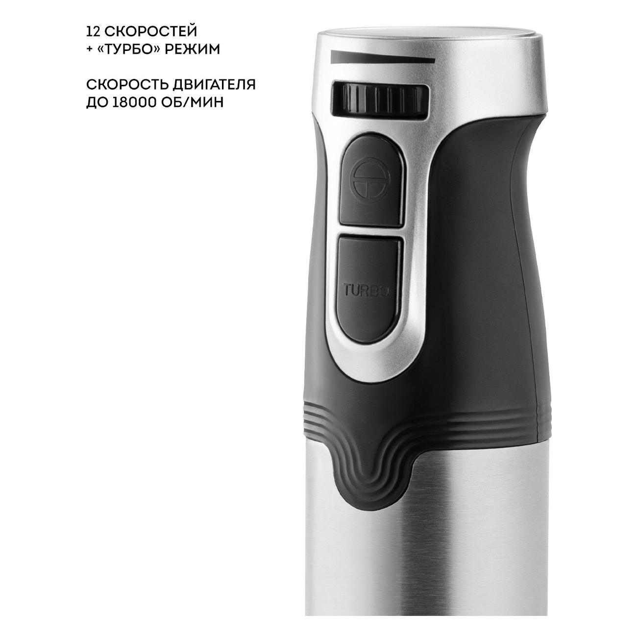 Защита от разбрызгивания и прорезиненное основание чаши обеспечивают комфортное использование. Подключение в сеть осуществляется за счет шнура длиной 1,18 м. В комплекте идет насадка-блендер, насадка-венчик, насадка-измельчитель, блендер, чаша, мерный стакан. Цвет — черный, с серебристыми вставками. Вес равен 1,4 кг. Габаритные размеры составляют 24х22х13 см.
