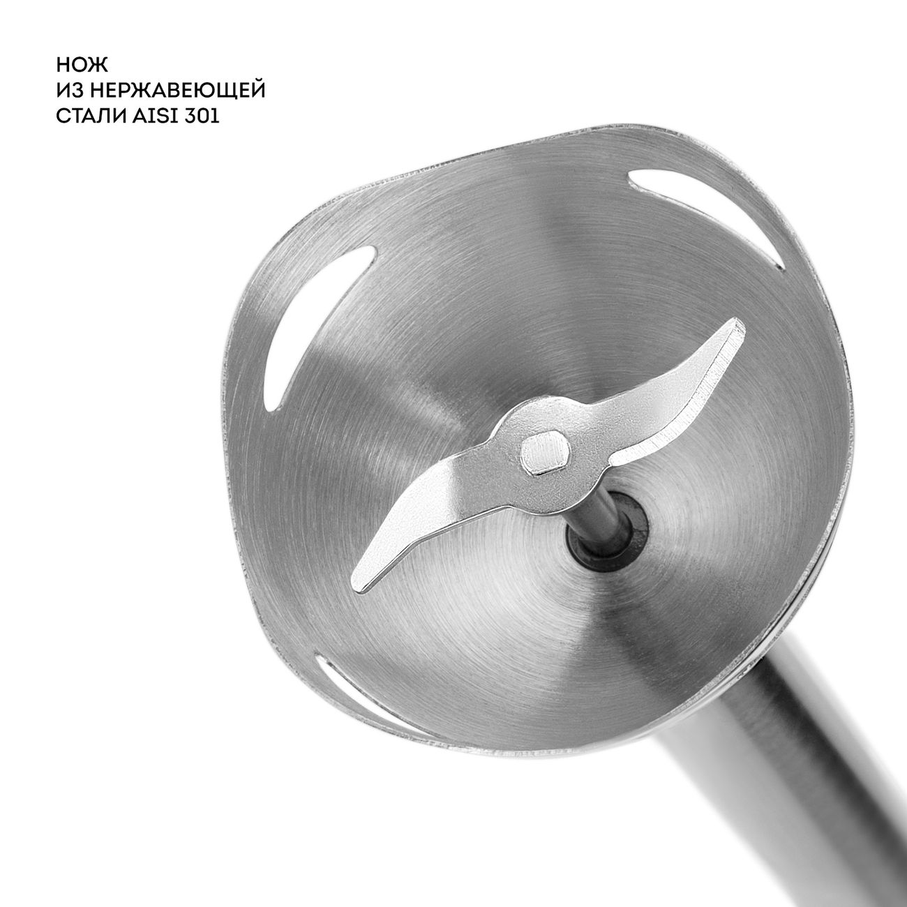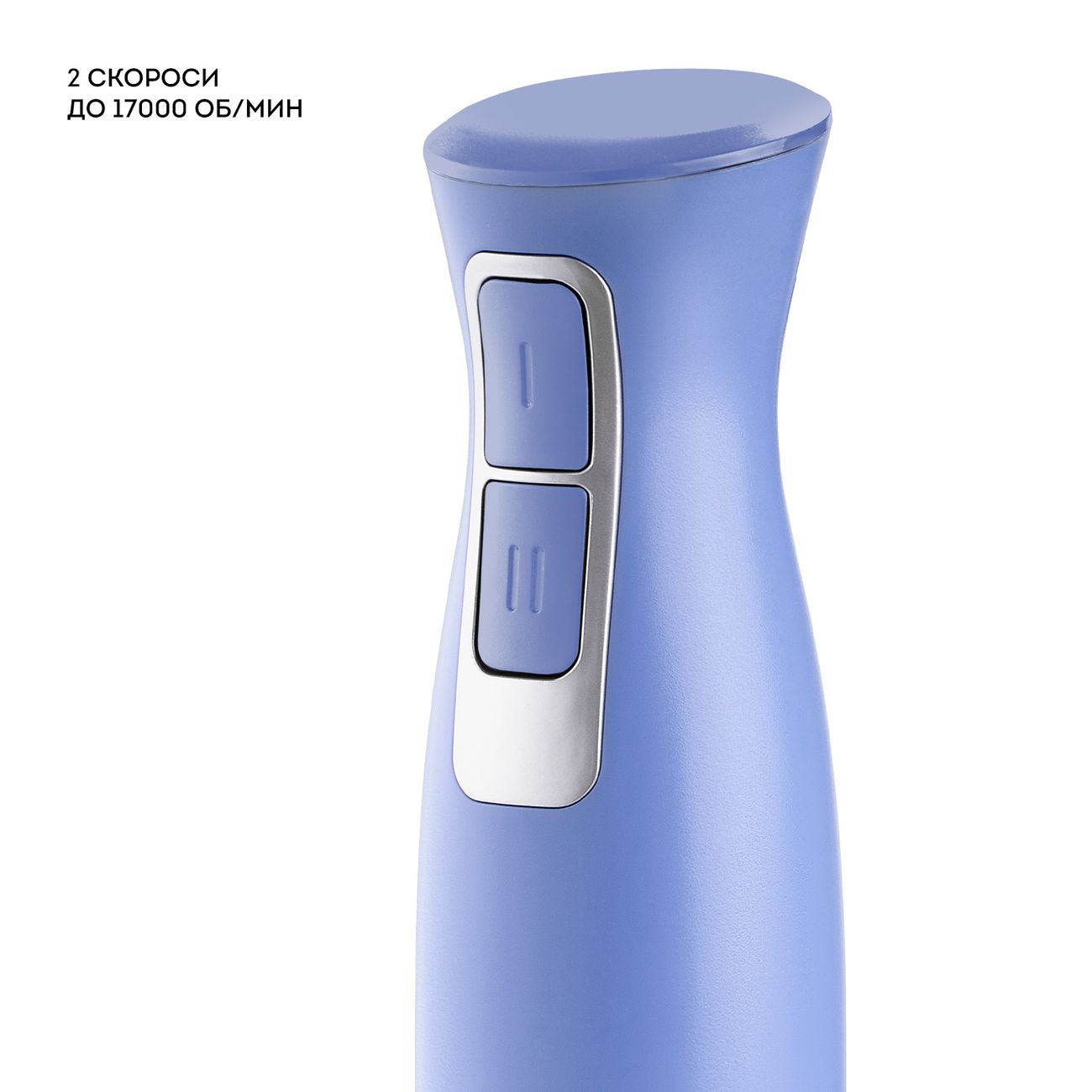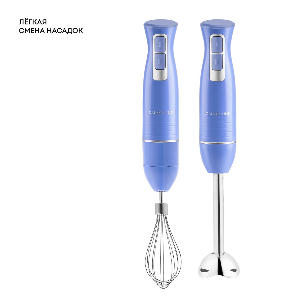 Погружной блендер Galaxy Line GL2143 оборудован медным двигателем DC с потребляемой мощностью 1000 Вт. Устройство работает от сети и подключается через шнур длиной 1,2 м. На синем пластиковом EVA корпусе расположены две кнопки управления, которые позволяют переключаться между двумя скоростями.