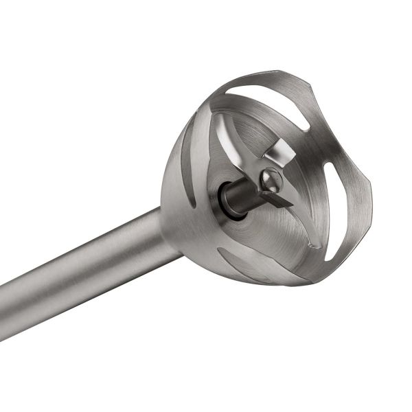 Корпус блендера, ножи, рабочие части насадок изготовлены из нержавеющей стали — прочного и гигиеничного материала, который не реагирует с пищевыми кислотами и легко поддается очистке. Отдельные элементы выполнены из пластика. Вес блендера — 900 г. Размеры устройства: 40х7х7 см.